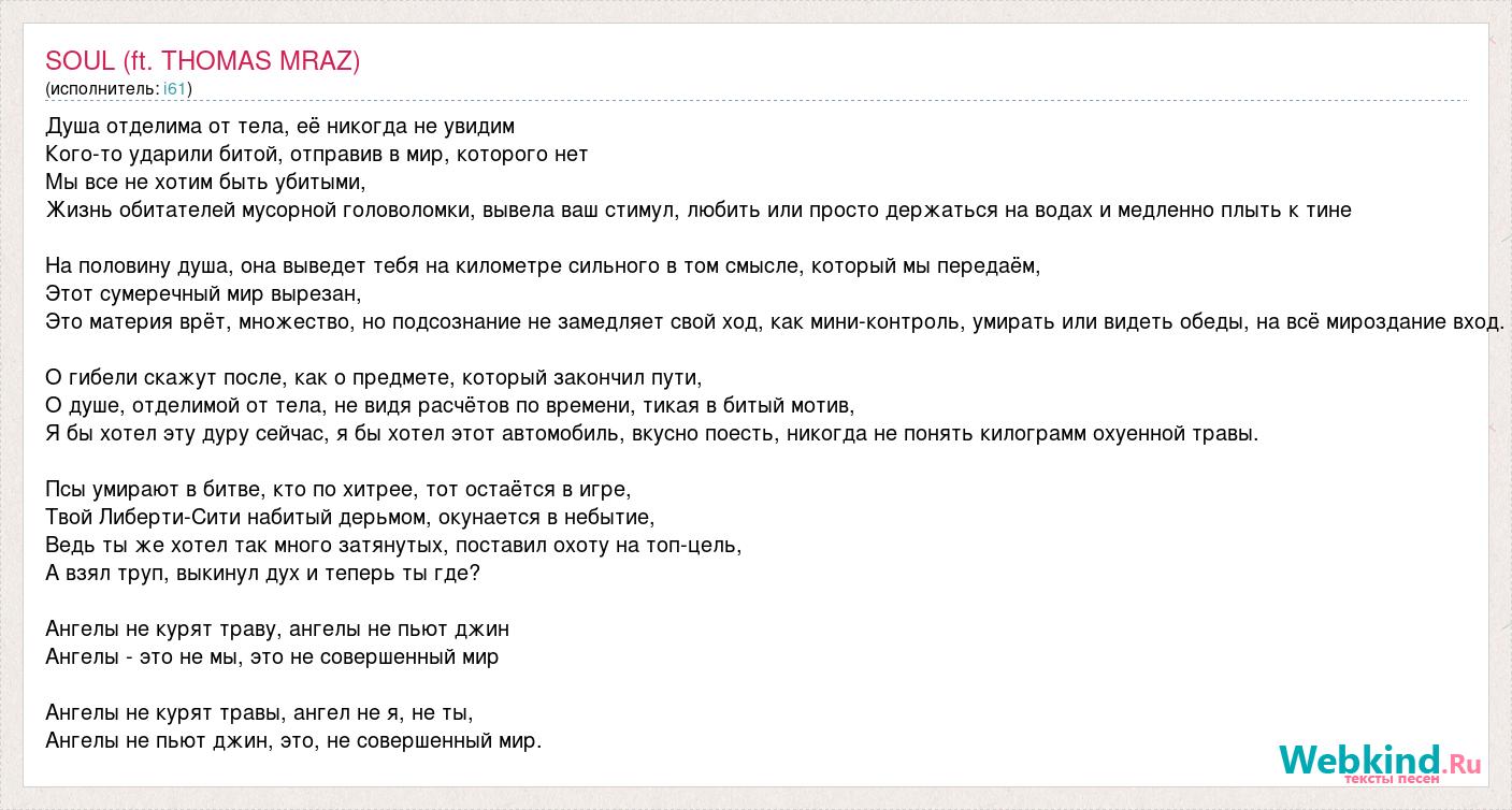 Душа отделима от тела, её никогда не увидим Кого-то ударили битой, отправив в мир, которого нет Мы все не хотим быть убитыми, Жизнь обитателей мусорной головоломки, вывела ваш стимул, любить или просто держаться на водах и медленно плыть к тине На половину душа, она выведет тебя на километре сильного в том смысле, который мы передаём, Этот сумеречный мир вырезан, Это материя врёт, множество, но подсознание не замедляет свой ход, как мини-контроль, умирать или видеть обеды, на всё мироздание вход. О гибели скажут после, как о предмете, который закончил пути, О душе, отделимой от тела, не видя расчётов по времени, тикая в битый мотив, Я бы хотел эту дуру сейчас, я бы хотел этот автомобиль, вкусно поесть, никогда не понять килограмм охуенной травы. Псы умирают в битве, кто по хитрее, тот остаётся в игре, Твой Либерти-Сити набитый дерьмом, окунается в небытие, Ведь ты же хотел так много затянутых, поставил охоту на топ-цель, А взял труп, выкинул дух и теперь ты где? Ангелы не курят траву, ангелы не пьют джин Ангелы - это не мы, это не совершенный мир Ангелы не курят травы, ангел не я, не ты, Ангелы не пьют джин, это, не совершенный мир.