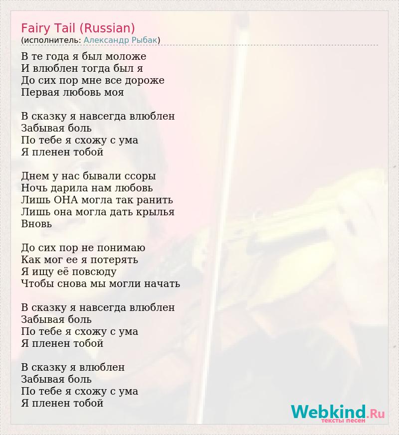 В те года я был моложе И влюблен тогда был я До сих пор мне все дороже Первая любовь моя В сказку я навсегда влюблен Забывая боль По тебе я схожу с ума Я пленен тобой Днем у нас бывали ссоры Ночь дарила нам любовь Лишь ОНА могла так ранить Лишь она могла дать крылья Вновь До сих пор не понимаю Как мог ее я потерять Я ищу её повсюду Чтобы снова мы могли начать В сказку я навсегда влюблен Забывая боль По тебе я схожу с ума Я пленен тобой В сказку я влюблен Забывая боль По тебе я схожу с ума Я пленен тобой