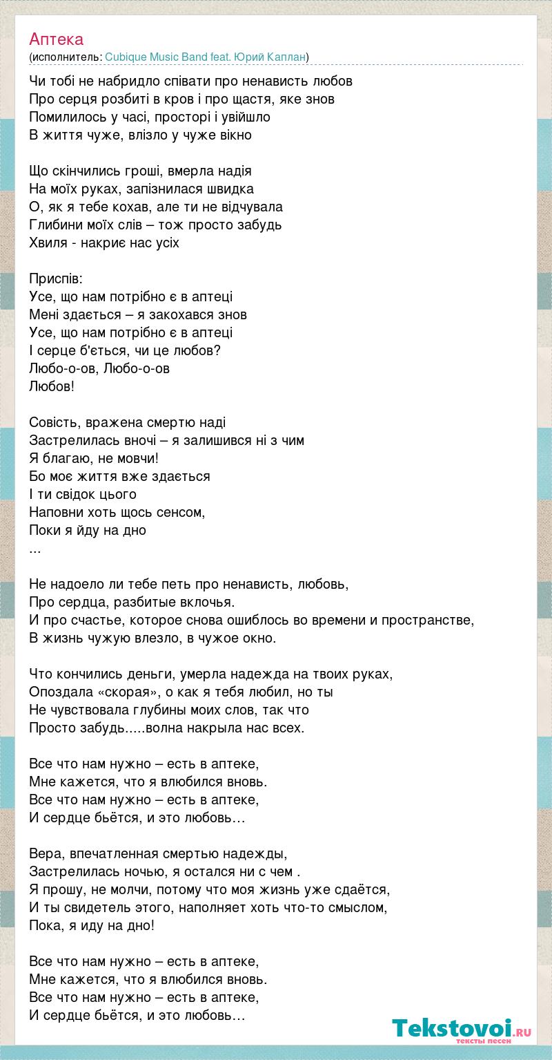 Чи тобі не набридло співати про ненависть любов Про серця розбиті в кров і про щастя, яке знов Помилилось у часі, просторі і увійшло В життя чуже, влізло у чуже вікно Що скінчились гроші, вмерла надія На моїх руках, запізнилася швидка О, як я тебе кохав, але ти не відчувала Глибини моїх слів – тож просто забудь Хвиля - накриє нас усіх Приспів: Усе, що нам потрібно є в аптеці Мені здається – я закохався знов Усе, що нам потрібно є в аптеці І серце б'ється, чи це любов? Любо-о-ов, Любо-о-ов Любов! Совість, вражена смертю наді Застрелилась вночі – я залишився ні з чим Я благаю, не мовчи! Бо моє життя вже здається І ти свідок цього Наповни хоть щось сенсом, Поки я йду на дно ... Не надоело ли тебе петь про ненависть, любовь, Про сердца, разбитые вклочья. И про счастье, которое снова ошиблось во времени и пространстве, В жизнь чужую влезло, в чужое окно. Что кончились деньги, умерла надежда на твоих руках, Опоздала «скорая», о как я тебя любил, но ты Не чувствовала глубины моих слов, так что Просто забудь.....волна накрыла нас всех. Все что нам нужно – есть в аптеке, Мне кажется, что я влюбился вновь. Все что нам нужно – есть в аптеке, И сердце бьётся, и это любовь… Вера, впечатленная смертью надежды, Застрелилась ночью, я остался ни с чем . Я прошу, не молчи, потому что моя жизнь уже сдаётся, И ты свидетель этого, наполняет хоть что-то смыслом, Пока, я иду на дно! Все что нам нужно – есть в аптеке, Мне кажется, что я влюбился вновь. Все что нам нужно – есть в аптеке, И сердце бьётся, и это любовь…