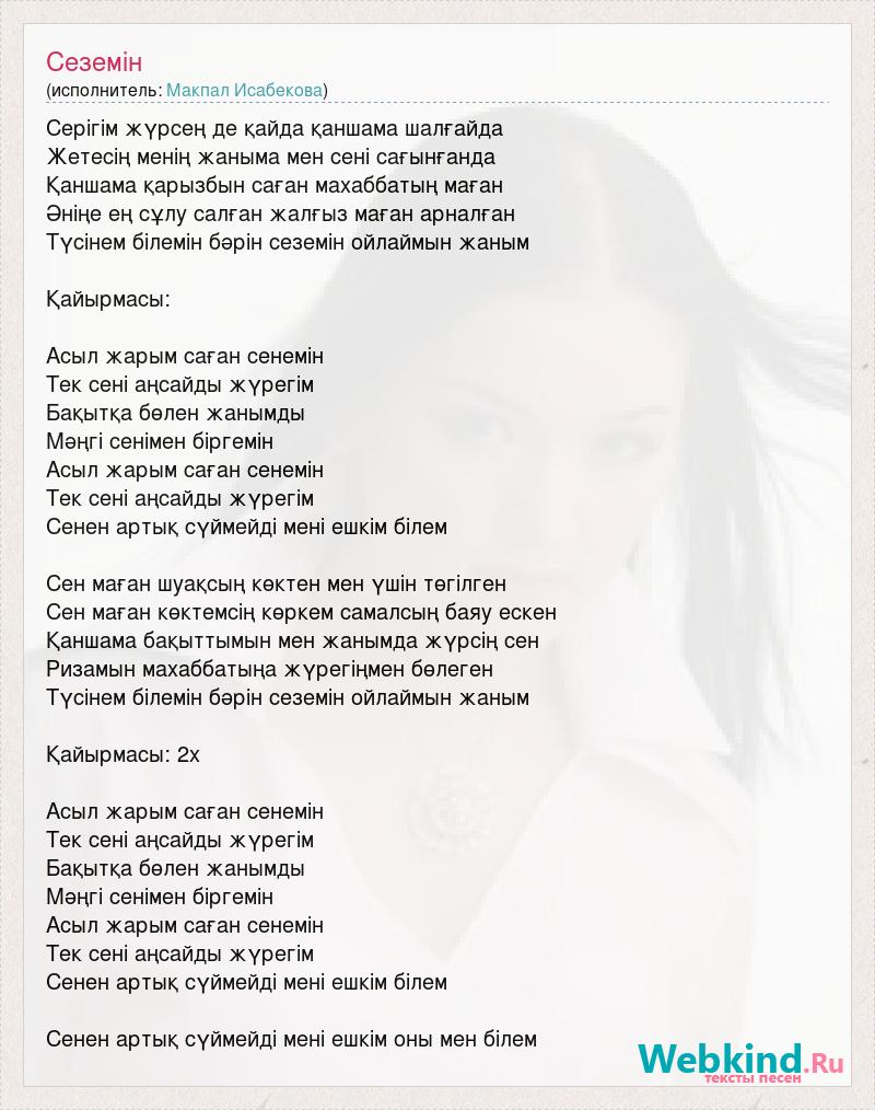 Серігім жүрсең де қайда қаншама шалғайда Жетесің менің жаныма мен сені сағынғанда Қаншама қарызбын саған махаббатың маған Әніңе ең сұлу салған жалғыз маған арналған Түсінем білемін бәрін сеземін ойлаймын жаным Қайырмасы: Асыл жарым саған сенемін Тек сені аңсайды жүрегім Бақытқа бөлен жанымды Мәңгі сенімен біргемін Асыл жарым саған сенемін Тек сені аңсайды жүрегім Сенен артық сүймейді мені ешкім білем Сен маған шуақсың көктен мен үшін төгілген Сен маған көктемсің көркем самалсың баяу ескен Қаншама бақыттымын мен жанымда жүрсің сен Ризамын махаббатыңа жүрегіңмен бөлеген Түсінем білемін бәрін сеземін ойлаймын жаным Қайырмасы: 2x Асыл жарым саған сенемін Тек сені аңсайды жүрегім Бақытқа бөлен жанымды Мәңгі сенімен біргемін Асыл жарым саған сенемін Тек сені аңсайды жүрегім Сенен артық сүймейді мені ешкім білем Сенен артық сүймейді мені ешкім оны мен білем
