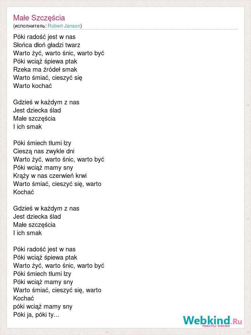 Póki radość jest w nas Słońca dłoń gładzi twarz Warto żyć, warto śnic, warto być Póki wciąż śpiewa ptak Rzeka ma źródeł smak Warto śmiać, cieszyć się Warto kochać Gdzieś w każdym z nas Jest dziecka ślad Małe szczęścia I ich smak Póki śmiech tłumi łzy Cieszą nas zwykle dni Warto żyć, warto śnic, warto być Póki wciąż mamy sny Krąży w nas czerwień krwi Warto śmiać, cieszyć się, warto Kochać Gdzieś w każdym z nas Jest dziecka ślad Małe szczęścia I ich smak Póki radość jest w nas Póki wciąż śpiewa ptak Warto żyć, warto śnic, warto być Póki śmiech tłumi łzy Póki wciąż mamy sny Warto śmiać, cieszyć się, warto Kochać póki wciąż mamy sny Póki ja, póki ty...