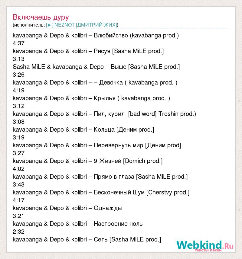 kavabanga & Depo & kolibri – Влюбийство (kavabanga prod.) 4:37 kavabanga & Depo & kolibri – Рисуя [Sasha MiLE prod.] 3:13 Sasha MiLE & kavabanga & Depo – Выше [Sasha MiLE prod.] 3:26 kavabanga & Depo & kolibri – – Девочка ( kavabanga prod. ) 4:19 kavabanga & Depo & kolibri – Крылья ( kavabanga prod. ) 3:12 kavabanga & Depo & kolibri – Пил, курил [bad word] Troshin prod.) 3:08 kavabanga & Depo & kolibri – Кольца [Деним prod.] 3:19 kavabanga & Depo & kolibri – Перевернуть мир [Деним prod] 3:27 kavabanga & Depo & kolibri – 9 Жизней [Domich prod.] 4:02 kavabanga & Depo & kolibri – Прямо в глаза [Sasha MiLE prod.] 3:43 kavabanga & Depo & kolibri – Бесконечный Шум [Cherstvy prod.] 4:17 kavabanga & Depo & kolibri – Однажды 3:21 kavabanga & Depo & kolibri – Настроение ноль 2:32 kavabanga & Depo & kolibri – Сеть [Sasha MiLE prod.]