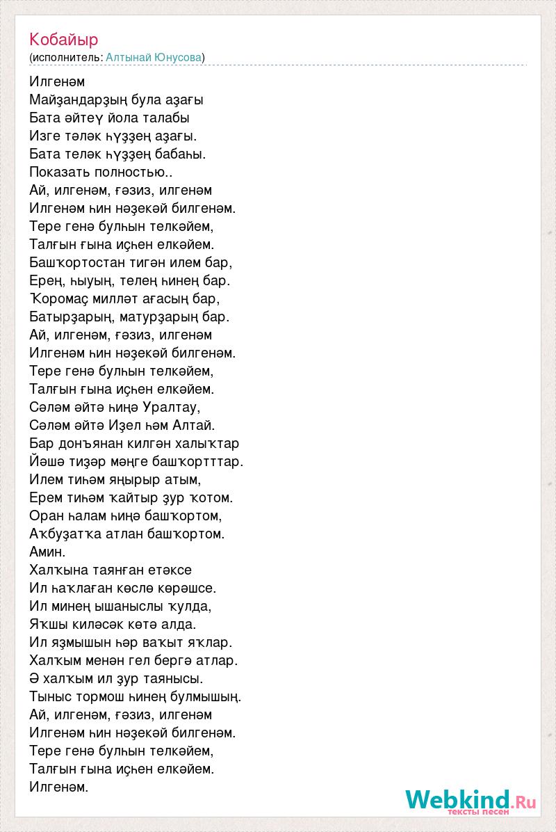 Илгенәм Майҙандарҙың була аҙағы Бата әйтеү йола талабы Изге тәләк һүҙҙең аҙағы. Бата теләк һүҙҙең бабаһы. Показать полностью.. Ай, илгенәм, ғәзиз, илгенәм Илгенәм һин нәҙекәй билгенәм. Тере генә булһын телкәйем, Талғын ғына иҫһен елкәйем. Башҡортостан тигән илем бар, Ерең, һыуың, телең һинең бар. Ҡоромаҫ милләт ағасың бар, Батырҙарың, матурҙарың бар. Ай, илгенәм, ғәзиз, илгенәм Илгенәм һин нәҙекәй билгенәм. Тере генә булһын телкәйем, Талғын ғына иҫһен елкәйем. Сәләм әйтә һиңә Уралтау, Сәләм әйтә Иҙел һәм Алтай. Бар донъянан килгән халыҡтар Йәшә тиҙәр мәңге башҡортттар. Илем тиһәм яңырыр атым, Ерем тиһәм ҡайтыр ҙур ҡотом. Оран һалам һиңә башҡортом, Аҡбуҙатҡа атлан башҡортом. Амин. Халҡына таянған етәксе Ил һаҡлаған көслө көрәшсе. Ил минең ышаныслы ҡулда, Яҡшы киләсәк көтә алда. Ил яҙмышын һәр ваҡыт яҡлар. Халҡым менән гел бергә атлар. Ә халҡым ил ҙур таянысы. Тыныс тормош һинең булмышың. Ай, илгенәм, ғәзиз, илгенәм Илгенәм һин нәҙекәй билгенәм. Тере генә булһын телкәйем, Талғын ғына иҫһен елкәйем. Илгенәм.