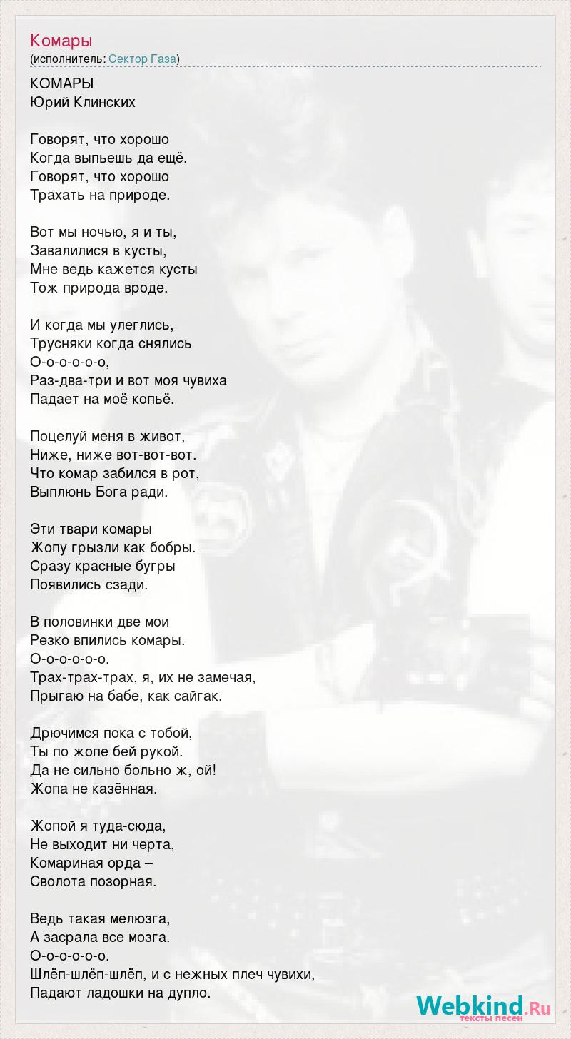 КОМАРЫ Юрий Клинских Говорят, что хорошо Когда выпьешь да ещё. Говорят, что хорошо Трахать на природе. Вот мы ночью, я и ты, Завалилися в кусты, Мне ведь кажется кусты Тож природа вроде. И когда мы улеглись, Трусняки когда снялись О-о-о-о-о-о, Раз-два-три и вот моя чувиха Падает на моё копьё. Поцелуй меня в живот, Ниже, ниже вот-вот-вот. Что комар забился в рот, Выплюнь Бога ради. Эти твари комары Жопу грызли как бобры. Сразу красные бугры Появились сзади. В половинки две мои Резко впились комары. О-о-о-о-о-о. Трах-трах-трах, я, их не замечая, Прыгаю на бабе, как сайгак. Дрючимся пока с тобой, Ты по жопе бей рукой. Да не сильно больно ж, ой! Жопа не казённая. Жопой я туда-сюда, Не выходит ни черта, Комариная орда – Сволота позорная. Ведь такая мелюзга, А засрала все мозга. О-о-о-о-о-о. Шлёп-шлёп-шлёп, и с нежных плеч чувихи, Падают ладошки на дупло.
