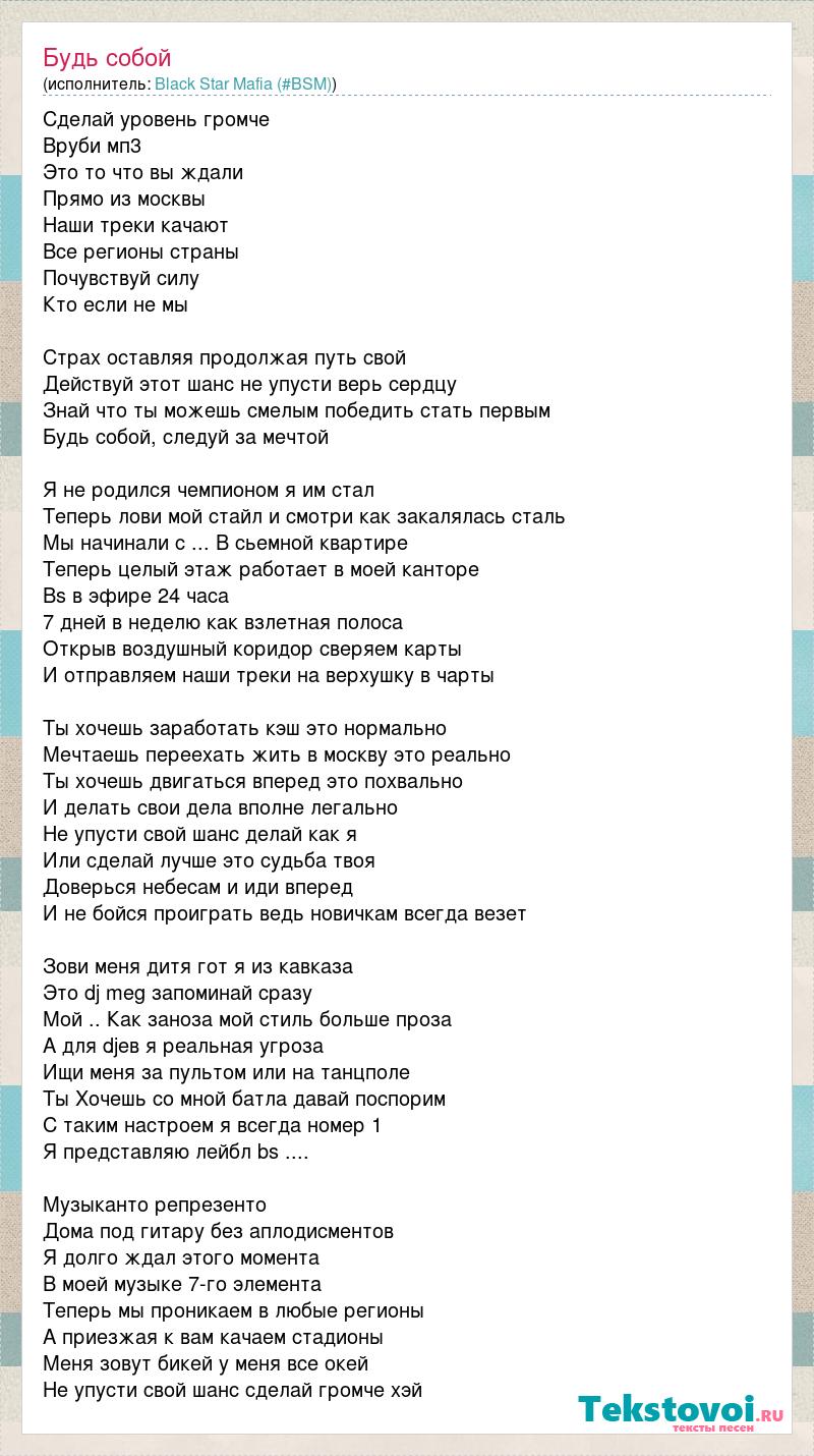 Сделай уровень громче Вруби мп3 Это то что вы ждали Прямо из москвы Наши треки качают Все регионы страны Почувствуй силу Кто если не мы Страх оставляя продолжая путь свой Действуй этот шанс не упусти верь сердцу Знай что ты можешь смелым победить стать первым Будь собой, следуй за мечтой Я не родился чемпионом я им стал Теперь лови мой стайл и смотри как закалялась сталь Мы начинали с ... В сьемной квартире Теперь целый этаж работает в моей канторе Bs в эфире 24 часа 7 дней в неделю как взлетная полоса Открыв воздушный коридор сверяем карты И отправляем наши треки на верхушку в чарты Ты хочешь заработать кэш это нормально Мечтаешь переехать жить в москву это реально Ты хочешь двигаться вперед это похвально И делать свои дела вполне легально Не упусти свой шанс делай как я Или сделай лучше это судьба твоя Доверься небесам и иди вперед И не бойся проиграть ведь новичкам всегда везет Зови меня дитя гот я из кавказа Это dj meg запоминай сразу Мой .. Как заноза мой стиль больше проза А для djев я реальная угроза Ищи меня за пультом или на танцполе Ты Хочешь со мной батла давай поспорим С таким настроем я всегда номер 1 Я представляю лейбл bs .... Музыканто репрезенто Дома под гитару без аплодисментов Я долго ждал этого момента В моей музыке 7-го элемента Теперь мы проникаем в любые регионы А приезжая к вам качаем стадионы Меня зовут бикей у меня все окей Не упусти свой шанс сделай громче хэй