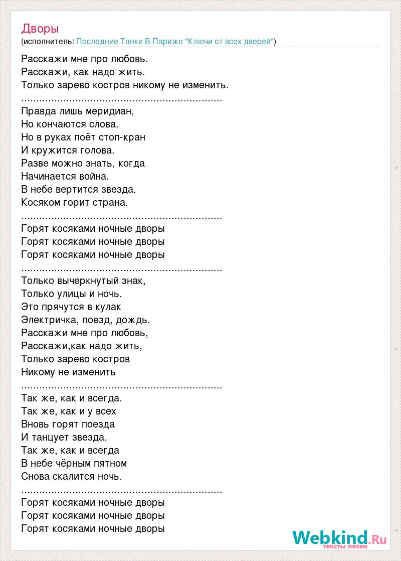 Расскажи мне про любовь. Расскажи, как надо жить. Только зарево костров никому не изменить. ................................................................... Правда лишь меридиан, Но кончаются слова. Но в руках поёт стоп-кран И кружится голова. Разве можно знать, когда Начинается война. В небе вертится звезда. Косяком горит страна. ................................................................... Горят косяками ночные дворы Горят косяками ночные дворы Горят косяками ночные дворы ................................................................... Только вычеркнутый знак, Только улицы и ночь. Это прячутся в кулак Электричка, поезд, дождь. Расскажи мне про любовь, Расскажи,как надо жить, Только зарево костров Никому не изменить ................................................................... Так же, как и всегда. Так же, как и у всех Вновь горят поезда И танцует звезда. Так же, как и всегда В небе чёрным пятном Снова скалится ночь. ................................................................... Горят косяками ночные дворы Горят косяками ночные дворы Горят косяками ночные дворы