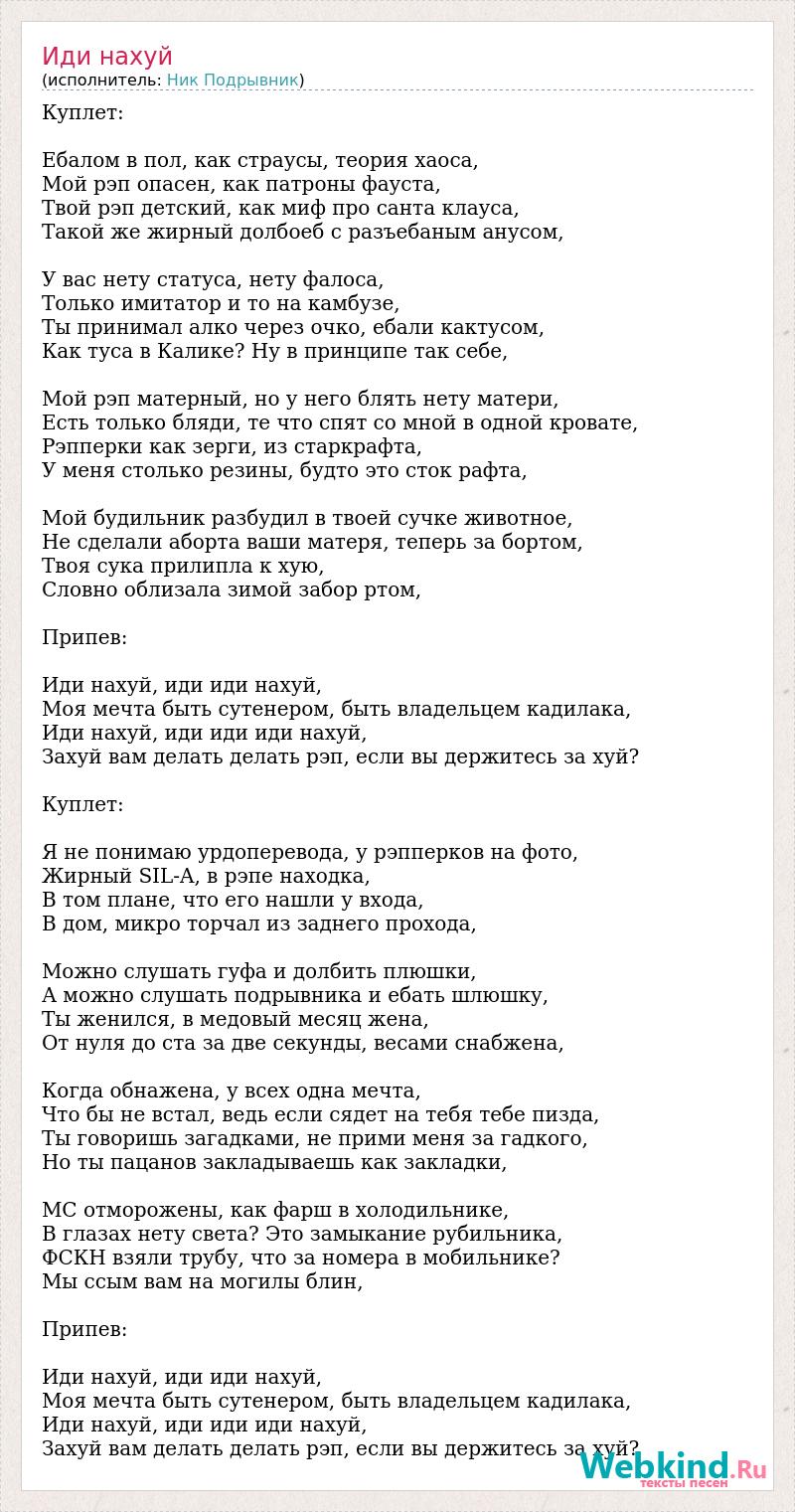 Куплет: Ебалом в пол, как страусы, теория хаоса, Мой рэп опасен, как патроны фауста, Твой рэп детский, как миф про санта клауса, Такой же жирный долбоеб с разъебаным анусом, У вас нету статуса, нету фалоса, Только имитатор и то на камбузе, Ты принимал алко через очко, ебали кактусом, Как туса в Калике? Ну в принципе так себе, Мой рэп матерный, но у него блять нету матери, Есть только бляди, те что спят со мной в одной кровате, Рэпперки как зерги, из старкрафта, У меня столько резины, будто это сток рафта, Мой будильник разбудил в твоей сучке животное, Не сделали аборта ваши матеря, теперь за бортом, Твоя сука прилипла к хую, Словно облизала зимой забор ртом, Припев: Иди нахуй, иди иди нахуй, Моя мечта быть сутенером, быть владельцем кадилака, Иди нахуй, иди иди иди нахуй, Захуй вам делать делать рэп, если вы держитесь за хуй? Куплет: Я не понимаю урдоперевода, у рэпперков на фото, Жирный SIL-A, в рэпе находка, В том плане, что его нашли у входа, В дом, микро торчал из заднего прохода, Можно слушать гуфа и долбить плюшки, А можно слушать подрывника и ебать шлюшку, Ты женился, в медовый месяц жена, От нуля до ста за две секунды, весами снабжена, Когда обнажена, у всех одна мечта, Что бы не встал, ведь если сядет на тебя тебе пизда, Ты говоришь загадками, не прими меня за гадкого, Но ты пацанов закладываешь как закладки, МС отморожены, как фарш в холодильнике, В глазах нету света? Это замыкание рубильника, ФСКН взяли трубу, что за номера в мобильнике? Мы ссым вам на могилы блин, Припев: Иди нахуй, иди иди нахуй, Моя мечта быть сутенером, быть владельцем кадилака, Иди нахуй, иди иди иди нахуй, Захуй вам делать делать рэп, если вы держитесь за хуй?