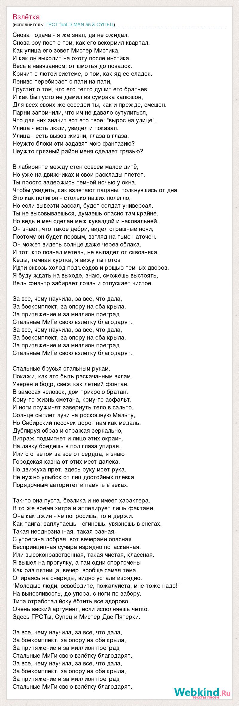 Снова подача - я же знал, да не ожидал. Снова boy поет о том, как его вскормил квартал. Как улица его зовет Мистер Мистика, И как он выходит на охоту после инстика. Весь в навязанном: от шмотья до повадок. Кричит о лютой системе, о том, как яд ее сладок. Лениво перебирает с пати на пати, Грустит о том, что его гетто душит его братьев. И как бы густо не дымил из сумрака капюшон, Для всех своих же соседей ты, как и прежде, смешон. Парни запомнили, что им не давало сутулиться, Что для них значит вот это твое: "вырос на улице". Улица - есть люди, увидел и показал. Улица - есть вызов жизни, глаза в глаза. Неужто блоки эти задавят мою фантазию? Неужто грязный район меня сделает грязью? В лабиринте между стен совсем малое дитё, Но уже на движниках и свои расклады плетет. Ты просто задержись темной ночью у окна, Чтобы увидеть, как взлетают пацаны, толкнувшись от дна. Это как полигон - столько наших полегло, Но если вывезти зассал, будет солдат универсал. Ты не высовываешься, думаешь опасно там крайне. Но ведь и меч сделан меж кувалдой и наковальней. Он знает, что такое дебри, видел страшные ночи, Поэтому он будет первым, взгляд на тьме наточен. Он может видеть солнце даже через облака. И тот, кто познал метель, не выпадет от сквозняка. Кеды, темная куртка, я вижу ты готов Идти сквозь холод подъездов и рощью темных дворов. Я буду ждать на выходе, знаю, сможешь выстоять, Ведь фильтр забирает грязь и отпускает чистое. За все, чему научила, за все, что дала, За боекомплект, за опору на оба крыла, За притяжение и за миллион преград Стальные МиГи свою взлётку благодарят. За все, чему научила, за все, что дала, За боекомплект, за опору на оба крыла, За притяжение и за миллион преград Стальные МиГи свою взлётку благодарят. Стальные брусья стальным рукам. Покажи, как это быть раскачанным вхлам. Уверен и бодр, свеж как летний фонтан. В замесах человек, дом прикрою братан. Кому-то жизнь сметана, кому-то асфальт. И ноги пружинят завернуть тело в сальто. Солнце сыплет лучи на роскошную Мальту, Но Сибирский песочек дорог нам как медаль. Дублируя образ и отражая зеркально, Витраж подмигнет и лицо этих окраин. На лавку бредешь в пол глаза упирая, Или с ответом за все от сердца, я знаю Городская казна от этих мест далека. Но движуха прет, здесь руку моет рука. Не нужно улыбок от лиц достойных плевка. Порядочным авторитет и память в веках. Так-то она пуста, безлика и не имеет характера. В то же время хитра и аппелирует лишь фактами. Она как джин - че попросишь, то и держи. Как тайга: заплутаешь - сгинешь, увязнешь в снегах. Такая неоднозначная, такая разная. С утрегана добрая, вот вечерами опасная. Беспринципная сучара изрядно потасканная. Или высоконравственная, такая чистая, классная. Я вышел на прогулку, а там одни спортсмены Как раз пятница, вечер, вообще самая тема. Опираясь на снаряды, видно устали изрядно. "Молодые люди, освободите, пожалуйста, мне тоже надо!" На выносливость, до упора, с ноги по забору. Типа отработал йоку ёбтить все здорово. Очень веский аргумент, если исполняешь четко. Здесь ГРОТы, Супец и Мистер Две Пятерки. За все, чему научила, за все, что дала, За боекомплект, за опору на оба крыла, За притяжение и за миллион преград Стальные МиГи свою взлётку благодарят. За все, чему научила, за все, что дала, За боекомплект, за опору на оба крыла, За притяжение и за миллион преград Стальные МиГи свою взлёт