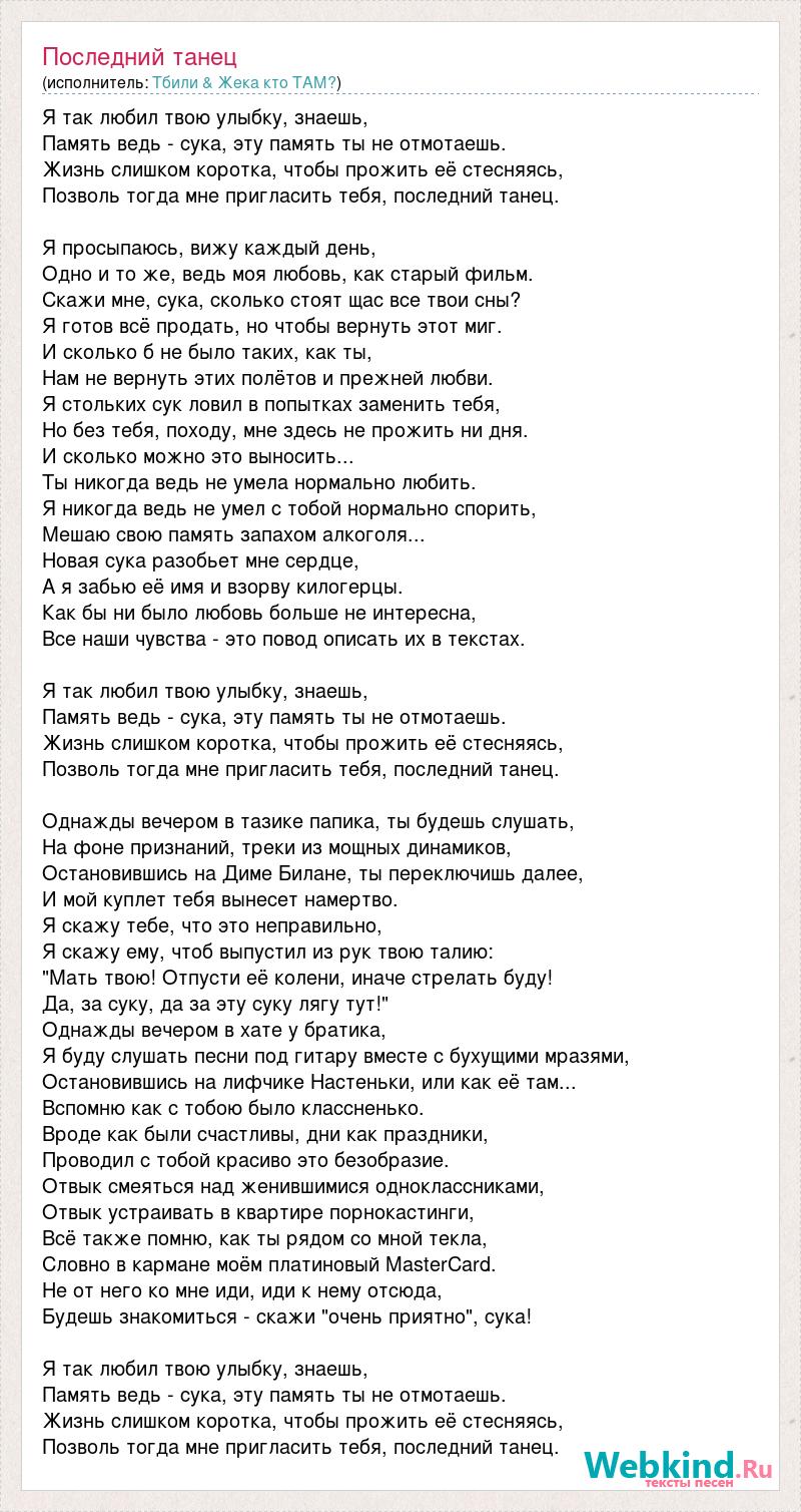 Я так любил твою улыбку, знаешь, Память ведь - сука, эту память ты не отмотаешь. Жизнь слишком коротка, чтобы прожить её стесняясь, Позволь тогда мне пригласить тебя, последний танец. Я просыпаюсь, вижу каждый день, Одно и то же, ведь моя любовь, как старый фильм. Скажи мне, сука, сколько стоят щас все твои сны? Я готов всё продать, но чтобы вернуть этот миг. И сколько б не было таких, как ты, Нам не вернуть этих полётов и прежней любви. Я стольких сук ловил в попытках заменить тебя, Но без тебя, походу, мне здесь не прожить ни дня. И сколько можно это выносить... Ты никогда ведь не умела нормально любить. Я никогда ведь не умел с тобой нормально спорить, Мешаю свою память запахом алкоголя... Новая сука разобьет мне сердце, А я забью её имя и взорву килогерцы. Как бы ни было любовь больше не интересна, Все наши чувства - это повод описать их в текстах. Я так любил твою улыбку, знаешь, Память ведь - сука, эту память ты не отмотаешь. Жизнь слишком коротка, чтобы прожить её стесняясь, Позволь тогда мне пригласить тебя, последний танец. Однажды вечером в тазике папика, ты будешь слушать, На фоне признаний, треки из мощных динамиков, Остановившись на Диме Билане, ты переключишь далее, И мой куплет тебя вынесет намертво. Я скажу тебе, что это неправильно, Я скажу ему, чтоб выпустил из рук твою талию: "Мать твою! Отпусти её колени, иначе стрелать буду! Да, за суку, да за эту суку лягу тут!" Однажды вечером в хате у братика, Я буду слушать песни под гитару вместе с бухущими мразями, Остановившись на лифчике Настеньки, или как её там... Вспомню как с тобою было классненько. Вроде как были счастливы, дни как праздники, Проводил с тобой красиво это безобразие. Отвык смеяться над женившимися одноклассниками, Отвык устраивать в квартире порнокастинги, Всё также помню, как ты рядом со мной текла, Словно в кармане моём платиновый MasterCard. Не от него ко мне иди, иди к нему отсюда, Будешь знакомиться - скажи "очень приятно", сука! Я так любил твою улыбку, знаешь, Память ведь - сука, эту память ты не отмотаешь. Жизнь слишком коротка, чтобы прожить её стесняясь, Позволь тогда мне пригласить тебя, последний танец.