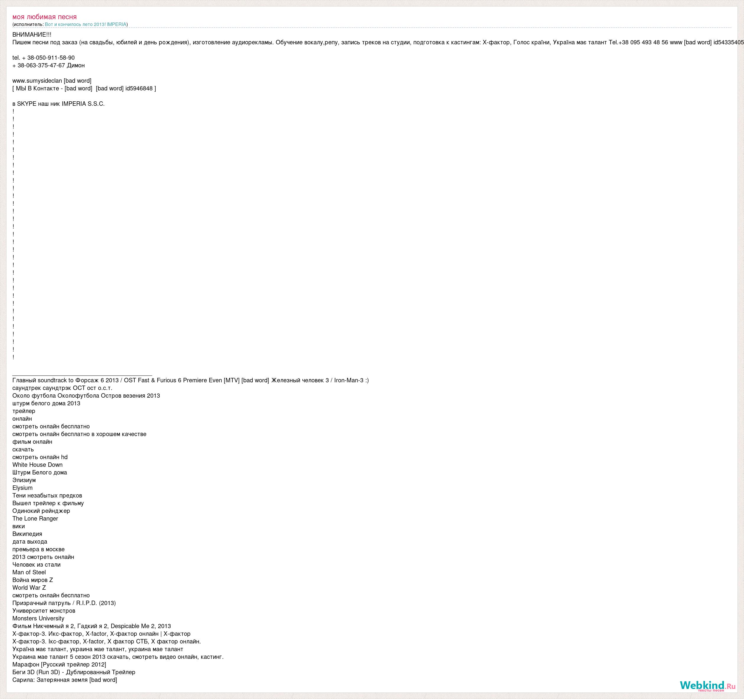 ВНИМАНИЕ!!! Пишем песни под заказ (на свадьбы, юбилей и день рождения), изготовление аудиорекламы. Обучение вокалу,репу, запись треков на студии, подготовка к кастингам: X-фактор, Голос країни, Україна має талант Tel.+38 095 493 48 56 www [bad word] id54335405 tel. + 38-050-911-58-90 + 38-063-375-47-67 Димон www.sumysideclan [bad word] [ МЫ В Контакте - [bad word] [bad word] id5946848 ] в SKYPE наш ник IMPERIA S.S.C. ! ! ! ! ! ! ! ! ! ! ! ! ! ! ! ! ! ! ! ! ! ! ! ! ! ! ! ! ! ! ! ! ! ___________________________________________ Главный soundtrack to Форсаж 6 2013 / OST Fast & Furious 6 Premiere Even [MTV] [bad word] Железный человек 3 / Iron-Man-3 :) саундтрек саундтрэк ОСТ ост о.с.т. Около футбола Околофутбола Остров везения 2013 штурм белого дома 2013 трейлер онлайн смотреть онлайн бесплатно смотреть онлайн бесплатно в хорошем качестве фильм онлайн скачать смотреть онлайн hd White House Down Штурм Белого дома Элизиум Elysium Тени незабытых предков Вышел трейлер к фильму Одинокий рейнджер The Lone Ranger вики Википедия дата выхода премьера в москве 2013 смотреть онлайн Человек из стали Man of Steel Война миров Z World War Z смотреть онлайн бесплатно Призрачный патруль / R.I.P.D. (2013) Университет монстров Monsters University Фильм Никчемный я 2, Гадкий я 2, Despicable Me 2, 2013 Х-фактор-3. Икс-фактор, X-factor, Х-фактор онлайн | Х-фактор Х-фактор-3. Ікс-фактор, X-factor, Х фактор СТБ, Х фактор онлайн. Україна має талант, украина мае талант, украина мае талант Украина мае талант 5 сезон 2013 скачать, смотреть видео онлайн, кастинг. Марафон [Русский трейлер 2012] Беги 3D (Run 3D) - Дублированный Трейлер Сарила: Затерянная земля [bad word]
