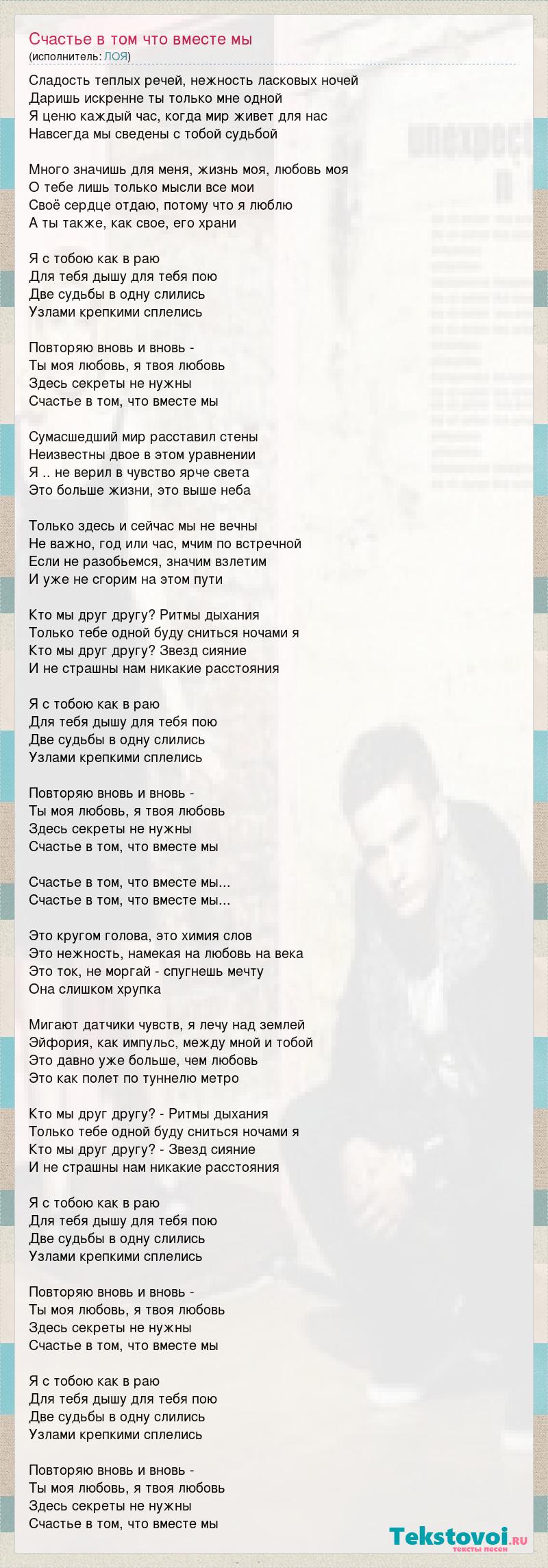 Сладость теплых речей, нежность ласковых ночей Даришь искренне ты только мне одной Я ценю каждый час, когда мир живет для нас Навсегда мы сведены с тобой судьбой Много значишь для меня, жизнь моя, любовь моя О тебе лишь только мысли все мои Своё сердце отдаю, потому что я люблю А ты также, как свое, его храни Я с тобою как в раю Для тебя дышу для тебя пою Две судьбы в одну слились Узлами крепкими сплелись Повторяю вновь и вновь - Ты моя любовь, я твоя любовь Здесь секреты не нужны Счастье в том, что вместе мы Сумасшедший мир расставил стены Неизвестны двое в этом уравнении Я .. не верил в чувство ярче света Это больше жизни, это выше неба Только здесь и сейчас мы не вечны Не важно, год или час, мчим по встречной Если не разобьемся, значим взлетим И уже не сгорим на этом пути Кто мы друг другу? Ритмы дыхания Только тебе одной буду сниться ночами я Кто мы друг другу? Звезд сияние И не страшны нам никакие расстояния Я с тобою как в раю Для тебя дышу для тебя пою Две судьбы в одну слились Узлами крепкими сплелись Повторяю вновь и вновь - Ты моя любовь, я твоя любовь Здесь секреты не нужны Счастье в том, что вместе мы Счастье в том, что вместе мы... Счастье в том, что вместе мы... Это кругом голова, это химия слов Это нежность, намекая на любовь на века Это ток, не моргай - спугнешь мечту Она слишком хрупка Мигают датчики чувств, я лечу над землей Эйфория, как импульс, между мной и тобой Это давно уже больше, чем любовь Это как полет по туннелю метро Кто мы друг другу? - Ритмы дыхания Только тебе одной буду сниться ночами я Кто мы друг другу? - Звезд сияние И не страшны нам никакие расстояния Я с тобою как в раю Для тебя дышу для тебя пою Две судьбы в одну слились Узлами крепкими сплелись Повторяю вновь и вновь - Ты моя любовь, я твоя любовь Здесь секреты не нужны Счастье в том, что вместе мы Я с тобою как в раю Для тебя дышу для тебя пою Две судьбы в одну слились Узлами крепкими сплелись Повторяю вновь и вновь - Ты моя любовь, я твоя любовь Здесь секреты не нужны Счастье в том, что вместе мы