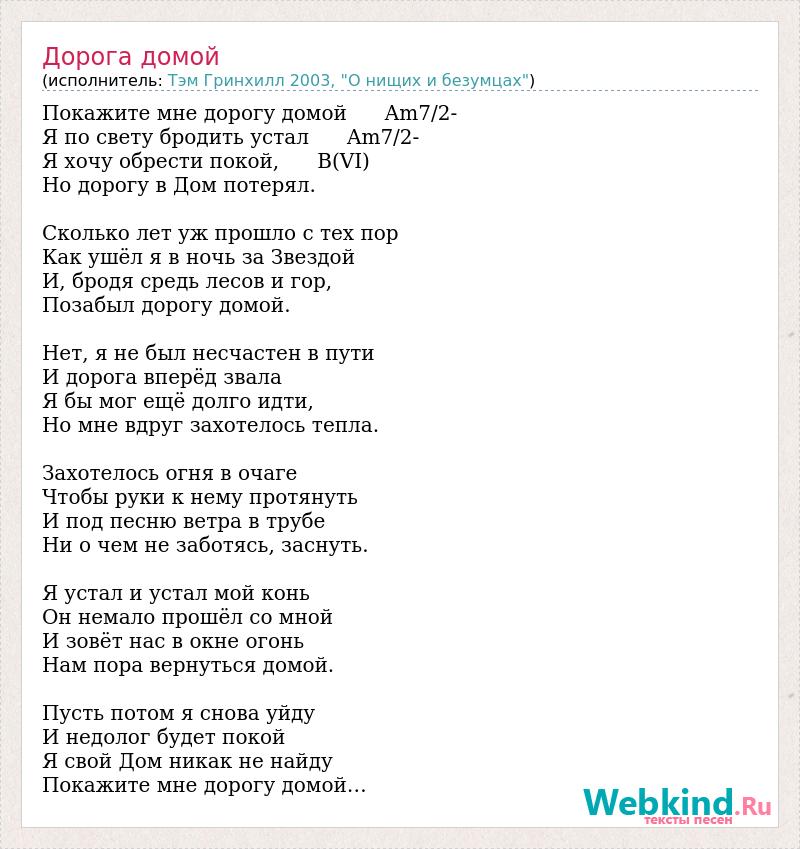 Покажите мне дорогу домой Am7/2- Я по свету бродить устал Am7/2- Я хочу обрести покой, B(VI) Но дорогу в Дом потерял. Сколько лет уж прошло с тех пор Как ушёл я в ночь за Звездой И, бродя средь лесов и гор, Позабыл дорогу домой. Нет, я не был несчастен в пути И дорога вперёд звала Я бы мог ещё долго идти, Но мне вдруг захотелось тепла. Захотелось огня в очаге Чтобы руки к нему протянуть И под песню ветра в трубе Ни о чем не заботясь, заснуть. Я устал и устал мой конь Он немало прошёл со мной И зовёт нас в окне огонь Нам пора вернуться домой. Пусть потом я снова уйду И недолог будет покой Я свой Дом никак не найду Покажите мне дорогу домой…