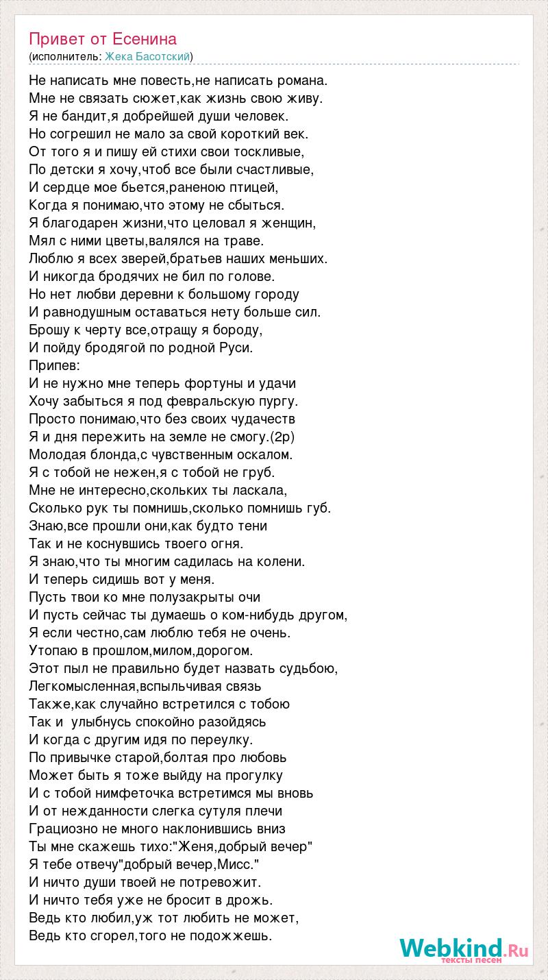 Не написать мне повесть,не написать романа. Мне не связать сюжет,как жизнь свою живу. Я не бандит,я добрейшей души человек. Но согрешил не мало за свой короткий век. От того я и пишу ей стихи свои тоскливые, По детски я хочу,чтоб все были счастливые, И сердце мое бьется,раненою птицей, Когда я понимаю,что этому не сбыться. Я благодарен жизни,что целовал я женщин, Мял с ними цветы,валялся на траве. Люблю я всех зверей,братьев наших меньших. И никогда бродячих не бил по голове. Но нет любви деревни к большому городу И равнодушным оставаться нету больше сил. Брошу к черту все,отращу я бороду, И пойду бродягой по родной Руси. Припев: И не нужно мне теперь фортуны и удачи Хочу забыться я под февральскую пургу. Просто понимаю,что без своих чудачеств Я и дня пережить на земле не смогу.(2р) Молодая блонда,с чувственным оскалом. Я с тобой не нежен,я с тобой не груб. Мне не интересно,скольких ты ласкала, Сколько рук ты помнишь,сколько помнишь губ. Знаю,все прошли они,как будто тени Так и не коснувшись твоего огня. Я знаю,что ты многим садилась на колени. И теперь сидишь вот у меня. Пусть твои ко мне полузакрыты очи И пусть сейчас ты думаешь о ком-нибудь другом, Я если честно,сам люблю тебя не очень. Утопаю в прошлом,милом,дорогом. Этот пыл не правильно будет назвать судьбою, Легкомысленная,вспыльчивая связь Также,как случайно встретился с тобою Так и улыбнусь спокойно разойдясь И когда с другим идя по переулку. По привычке старой,болтая про любовь Может быть я тоже выйду на прогулку И с тобой нимфеточка встретимся мы вновь И от нежданности слегка сутуля плечи Грациозно не много наклонившись вниз Ты мне скажешь тихо:"Женя,добрый вечер" Я тебе отвечу"добрый вечер,Мисс." И ничто души твоей не потревожит. И ничто тебя уже не бросит в дрожь. Ведь кто любил,уж тот любить не может, Ведь кто сгорел,того не подожжешь.