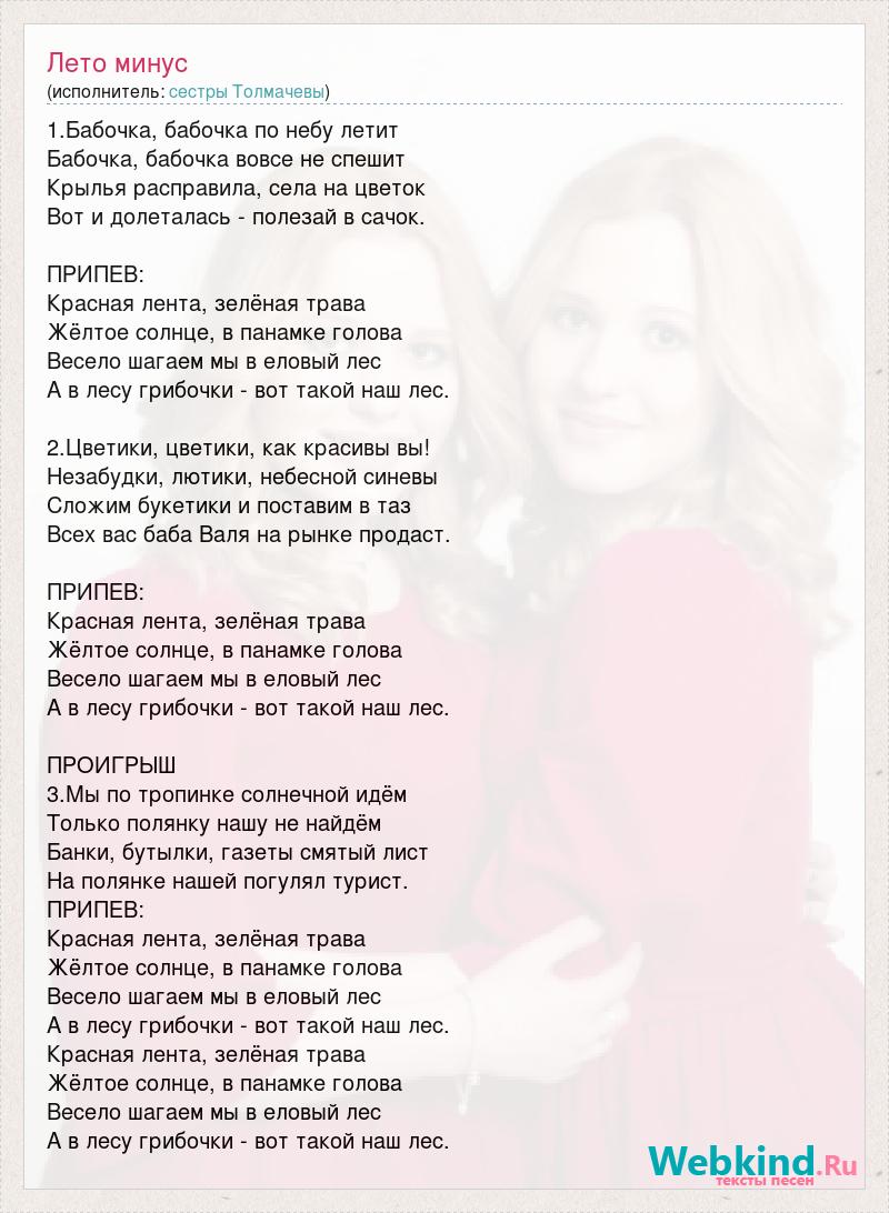 1.Бабочка, бабочка по небу летит Бабочка, бабочка вовсе не спешит Крылья расправила, села на цветок Вот и долеталась - полезай в сачок. ПРИПЕВ: Красная лента, зелёная трава Жёлтое солнце, в панамке голова Весело шагаем мы в еловый лес А в лесу грибочки - вот такой наш лес. 2.Цветики, цветики, как красивы вы! Незабудки, лютики, небесной синевы Сложим букетики и поставим в таз Всех вас баба Валя на рынке продаст. ПРИПЕВ: Красная лента, зелёная трава Жёлтое солнце, в панамке голова Весело шагаем мы в еловый лес А в лесу грибочки - вот такой наш лес. ПРОИГРЫШ 3.Мы по тропинке солнечной идём Только полянку нашу не найдём Банки, бутылки, газеты смятый лист На полянке нашей погулял турист. ПРИПЕВ: Красная лента, зелёная трава Жёлтое солнце, в панамке голова Весело шагаем мы в еловый лес А в лесу грибочки - вот такой наш лес. Красная лента, зелёная трава Жёлтое солнце, в панамке голова Весело шагаем мы в еловый лес А в лесу грибочки - вот такой наш лес.