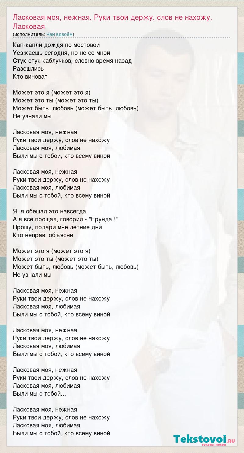 Кап-капли дождя по мостовой Уезжаешь сегодня, но не со мной Стук-стук каблучков, словно время назад Разошлись Кто виноват Может это я (может это я) Может это ты (может это ты) Может быть, любовь (может быть, любовь) Не узнали мы Ласковая моя, нежная Руки твои держу, слов не нахожу Ласковая моя, любимая Были мы с тобой, кто всему виной Ласковая моя, нежная Руки твои держу, слов не нахожу Ласковая моя, любимая Были мы с тобой, кто всему виной Я, я обещал это навсегда А я все прощал, говорил - "Ерунда !" Прошу, подари мне летние дни Кто неправ, объясни Может это я (может это я) Может это ты (может это ты) Может быть, любовь (может быть, любовь) Не узнали мы Ласковая моя, нежная Руки твои держу, слов не нахожу Ласковая моя, любимая Были мы с тобой, кто всему виной Ласковая моя, нежная Руки твои держу, слов не нахожу Ласковая моя, любимая Были мы с тобой, кто всему виной Ласковая моя, нежная Руки твои держу, слов не нахожу Ласковая моя, любимая Были мы с тобой... Ласковая моя, нежная Руки твои держу, слов не нахожу Ласковая моя, любимая Были мы с тобой, кто всему виной