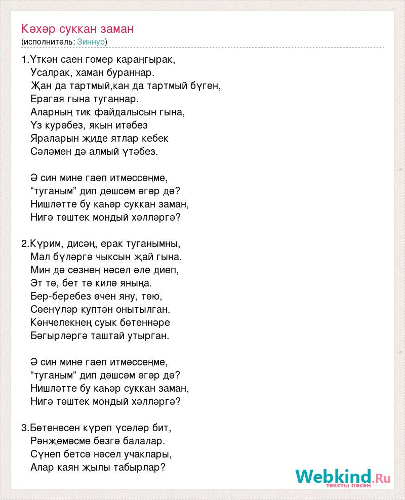 1.Үткән саен гомер караңгырак, Усалрак, хаман бураннар. Җан да тартмый,кан да тартмый бүген, Ерагая гына туганнар. Аларның тик файдалысын гына, Үз курәбез, якын итәбез Яраларын җиде ятлар кебек Сәләмен дә алмый үтәбез. Ә син мине гаеп итмәссеңме, “туганым” дип дәшсәм әгәр дә? Нишләтте бу каһәр суккан заман, Нигә төштек мондый хәлләргә? 2.Күрим, дисәң, ерак туганымны, Мал бүләргә чыксын җай гына. Мин дә сезнең нәсел әле диеп, Эт тә, бет тә килә яныңа. Бер-беребез өчен яну, төю, Сөенүләр куптән онытылган. Көнчелекнең суык бөтеннәре Бәгырләргә таштай утырган. Ә син мине гаеп итмәссеңме, “туганым” дип дәшсәм әгәр дә? Нишләтте бу каһәр суккан заман, Нигә төштек мондый хәлләргә? 3.Бөтенесен күреп үсәләр бит, Рәнҗемәсме безгә балалар. Сүнеп бетсә нәсел учаклары, Алар каян җылы табырлар?
