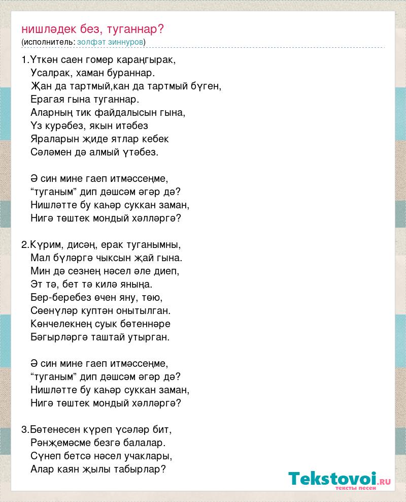 1.Үткән саен гомер караңгырак, Усалрак, хаман бураннар. Җан да тартмый,кан да тартмый бүген, Ерагая гына туганнар. Аларның тик файдалысын гына, Үз курәбез, якын итәбез Яраларын җиде ятлар кебек Сәләмен дә алмый үтәбез. Ә син мине гаеп итмәссеңме, “туганым” дип дәшсәм әгәр дә? Нишләтте бу каһәр суккан заман, Нигә төштек мондый хәлләргә? 2.Күрим, дисәң, ерак туганымны, Мал бүләргә чыксын җай гына. Мин дә сезнең нәсел әле диеп, Эт тә, бет тә килә яныңа. Бер-беребез өчен яну, төю, Сөенүләр куптән онытылган. Көнчелекнең суык бөтеннәре Бәгырләргә таштай утырган. Ә син мине гаеп итмәссеңме, “туганым” дип дәшсәм әгәр дә? Нишләтте бу каһәр суккан заман, Нигә төштек мондый хәлләргә? 3.Бөтенесен күреп үсәләр бит, Рәнҗемәсме безгә балалар. Сүнеп бетсә нәсел учаклары, Алар каян җылы табырлар?