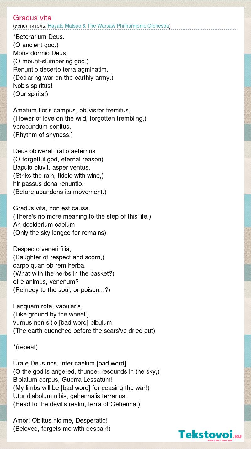 *Beterarium Deus. (O ancient god.) Mons dormio Deus, (O mount-slumbering god,) Renuntio decerto terra agminatim. (Declaring war on the earthly army.) Nobis spiritus! (Our spirits!) Amatum floris campus, oblivisror fremitus, (Flower of love on the wild, forgotten trembling,) verecundum sonitus. (Rhythm of shyness.) Deus obliverat, ratio aeternus (O forgetful god, eternal reason) Bapulo pluvit, asper ventus, (Striks the rain, fiddle with wind,) hir passus dona renuntio. (Before abandons its movement.) Gradus vita, non est causa. (There's no more meaning to the step of this life.) An desiderium caelum (Only the sky longed for remains) Despecto veneri filia, (Daughter of respect and scorn,) carpo quan ob rem herba, (What with the herbs in the basket?) et e animus, venenum? (Remedy to the soul, or poison...?) Lanquam rota, vapularis, (Like ground by the wheel,) vurnus non sitio terrus bibulum (The earth quenched before the scars've dried out) *(repeat) Ura e Deus nos, inter caelum tonitrus, (O the god is angered, thunder resounds in the sky,) Biolatum corpus, Guerra Lessatum! (My limbs will be crushed for ceasing the war!) Utur diabolum ulbis, gehennalis terrarius, (Head to the devil's realm, terra of Gehenna,) Amor! Oblitus hic me, Desperatio! (Beloved, forgets me with despair!)