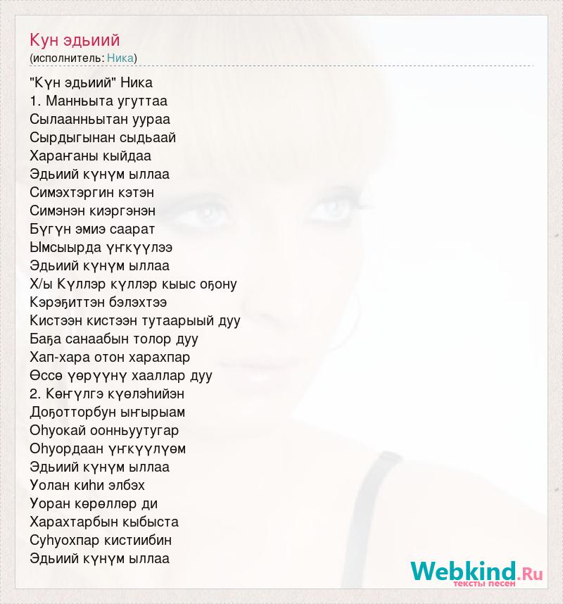 "Күн эдьиий" Ника 1. Манньыта угуттаа Сылаанньытан уураа Сырдыгынан сыдьаай Хараҥаны кыйдаа Эдьиий күнүм ыллаа Симэхтэргин кэтэн Симэнэн киэргэнэн Бүгүн эмиэ саарат Ымсыырда үҥкүүлээ Эдьиий күнүм ыллаа Х/ы Күллэр күллэр кыыс оҕону Кэрэҕиттэн бэлэхтээ Кистээн кистээн тутаарыый дуу Баҕа санаабын толор дуу Хап-хара отон харахпар Өссө үөрүүнү хааллар дуу 2. Көҥүлгэ күөлэhийэн Доҕотторбун ыҥырыам Оhуокай оонньуутугар Оhуордаан үҥкүүлүөм Эдьиий күнүм ыллаа Уолан киhи элбэх Уоран көрөллөр ди Харахтарбын кыбыста Суhуохпар кистиибин Эдьиий күнүм ыллаа