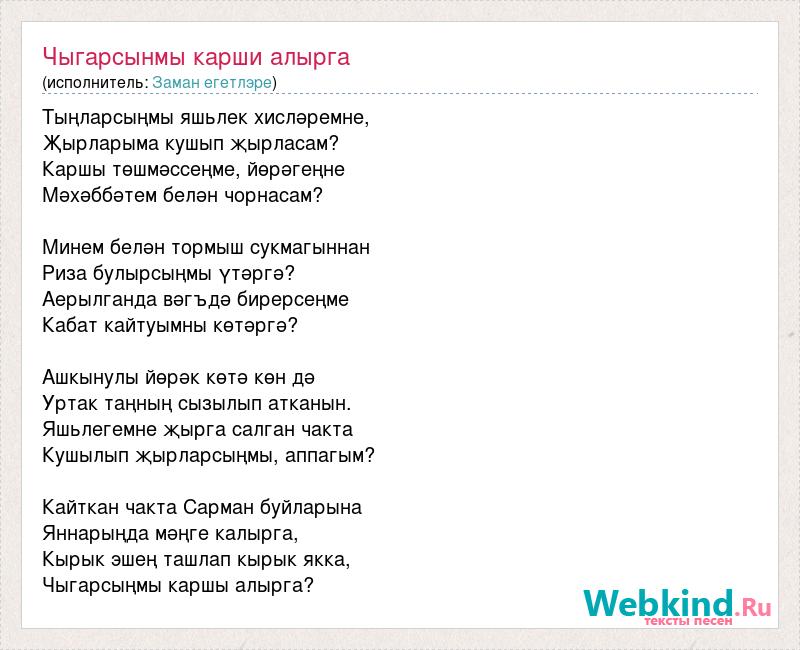 Тыңларсыңмы яшьлек хисләремне, Җырларыма кушып җырласам? Каршы төшмәссеңме, йөрәгеңне Мәхәббәтем белән чорнасам? Минем белән тормыш сукмагыннан Риза булырсыңмы үтәргә? Аерылганда вәгъдә бирерсеңме Кабат кайтуымны көтәргә? Ашкынулы йөрәк көтә көн дә Уртак таңның сызылып атканын. Яшьлегемне җырга салган чакта Кушылып җырларсыңмы, аппагым? Кайткан чакта Сарман буйларына Яннарыңда мәңге калырга, Кырык эшең ташлап кырык якка, Чыгарсыңмы каршы алырга?