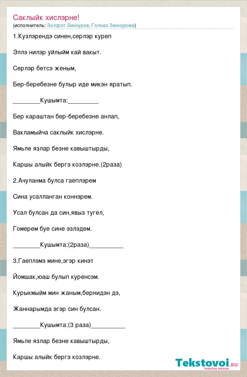 1.Кузлэрендэ синен,серлэр куреп Эллэ нилэр уйлыйм кай вакыт. Серлэр бетсэ женым, Бер-беребезне булыр иде микэн яратып. ________Кушымта:_________ Бер караштан бер-беребезне анлап, Вакламыйча саклыйк хислэрне. Ямьле язлар безне кавыштырды, Каршы алыйк бергэ козлэрне.(2раза) 2.Ачуланма булса гаеплэрем Сина усалланган коннэрем. Усал булсан да син,явыз тугел, Гомерем буе сине эзлэдем. ________Кушымта:(2раза)__________ 3.Гаеплэмэ мине,эгэр кинэт Йомшак,юаш булып куренсэм. Курыкмыйм мин жаным,бернидэн дэ, Жаннарымда эгэр син булсан. ________Кушымта:(3 раза)__________ Ямьле язлар безне кавыштырды, Каршы алыйк бергэ козлэрне.