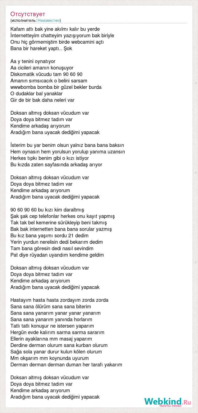 Kafam attı bak yine akılmı kalır bu yerde İnternetteyim chatteyim yazışıyorum bak biriyle Onu hiç görmemiştim birde webcamini açtı Bana bir hareket yaptı.. Şok Aa y tenini oynatıyor Aa cicileri amanın konuşuyor Diskomatik vücudu tam 90 60 90 Amanın sımsıcacık o belini sarsam wwwbomba bomba bir güzel bekler burda O dudaklar bal yanaklar Gir de bir bak daha neleri var Doksan altmış doksan vücudum var Doya doya bitmez tadım var Kendime arkadaş arıyorum Aradığım bana uyacak dediğimi yapacak İsterim bu yar benim olsun yalnız bana bana baksın Hem oynasın hem yorulsun yorulup yanıma uzansın Herkes tıpkı benim gibi o kızı istiyor Bu kızda zaten sayfasında arkadaş arıyor Doksan altmış doksan vücudum var Doya doya bitmez tadım var Kendime arkadaş arıyorum Aradığım bana uyacak dediğimi yapacak 90 60 90 60 bu kızı kim daraltmış Şak şak cep telefonlar herkes onu kayıt yapmış Tak tak bel kemerine sürükleyip beni takmış Bak bak internetten bana bana sorular yazmış Bu kız bana yaşımı sordu 21 dedim Yerin yurdun nerelisin dedi bekarım dedim Tam bana göresin dedi nasıl sevindim Pat diye rüyadan uyandım kendime geldim Doksan altmış doksan vücudum var Doya doya bitmez tadım var Kendime arkadaş arıyorum Aradığım bana uyacak dediğimi yapacak Hastayım hasta hasta zordayım zorda zorda Sana sana ölürüm sana sana biterim Sana sana yanarım yanar yanar yanarım Sana sana yanarım yanında horlarım Tatlı tatlı konuşur ne istersen yaparım Hergün evde kalırım sarma sarma sararım Ellerin ayaklarına mm masaj yaparım Derdine derman olurum sana kurban olurum Sağa sola yanar durur kulun kölen olurum Mm okşarım mm koynunda uyurum Derman derman derman duman her tarafı yakarım Doksan altmış doksan vücudum var Doya doya bitmez tadım var Kendime arkadaş arıyorum Aradığım bana uyacak dediğimi yapacak