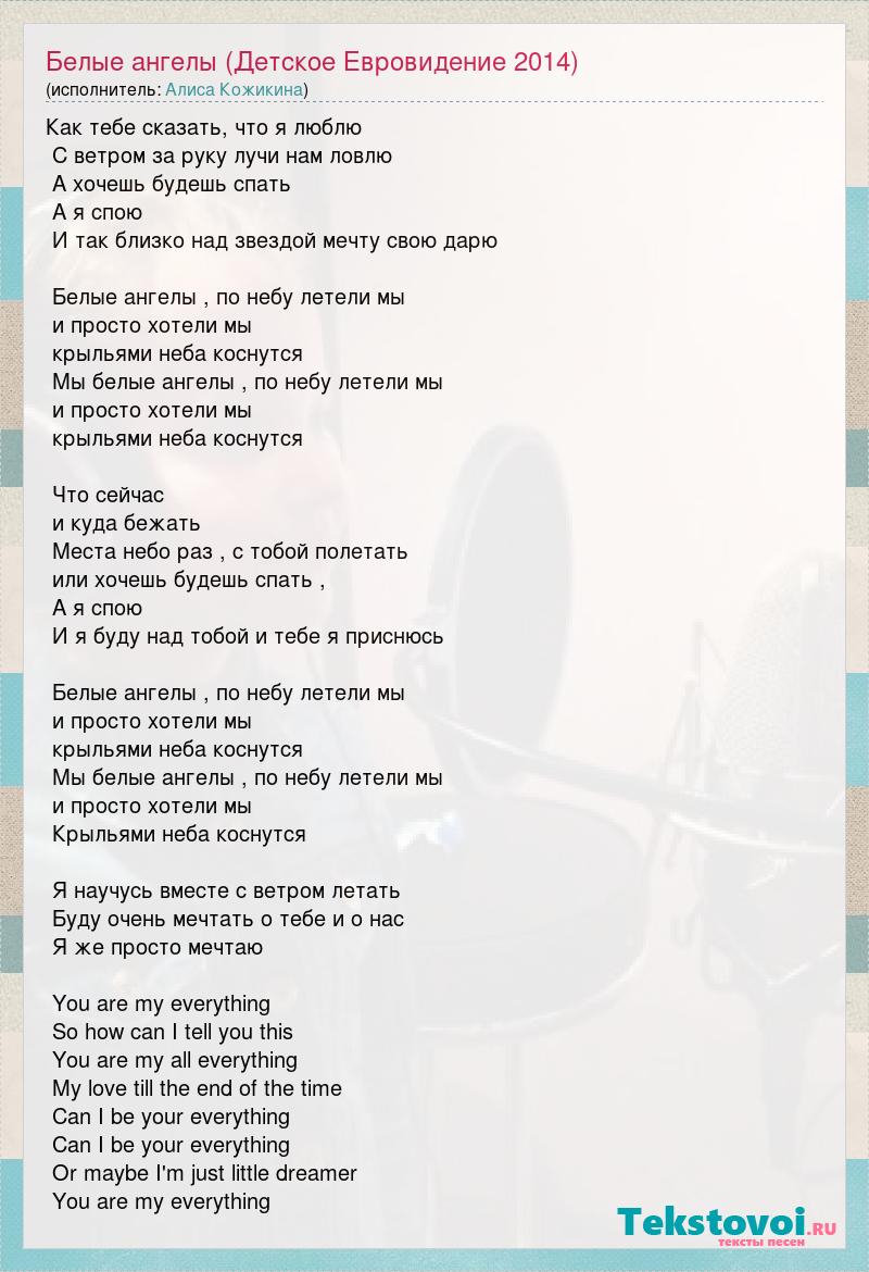 Как тебе сказать, что я люблю С ветром за руку лучи нам ловлю А хочешь будешь спать А я спою И так близко над звездой мечту свою дарю Белые ангелы , по небу летели мы и просто хотели мы крыльями неба коснутся Мы белые ангелы , по небу летели мы и просто хотели мы крыльями неба коснутся Что сейчас и куда бежать Места небо раз , с тобой полетать или хочешь будешь спать , А я спою И я буду над тобой и тебе я приснюсь Белые ангелы , по небу летели мы и просто хотели мы крыльями неба коснутся Мы белые ангелы , по небу летели мы и просто хотели мы Крыльями неба коснутся Я научусь вместе с ветром летать Буду очень мечтать о тебе и о нас Я же просто мечтаю You are my everything So how can I tell you this You are my all everything My love till the end of the time Can I be your everything Can I be your everything Or maybe I'm just little dreamer You are my everything
