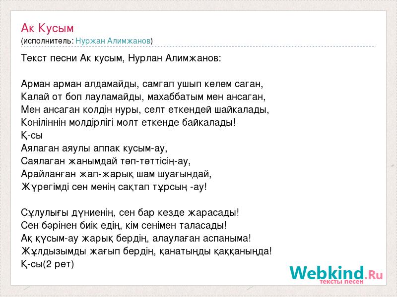 Текст песни Ак кусым, Нурлан Алимжанов: Арман арман алдамайды, самгап ушып келем саган, Калай от боп лауламайды, махаббатым мен ансаган, Мен ансаган колдін нуры, селт еткендей шайкалады, Коніліннін молдірлігі молт еткенде байкалады! Қ-сы Аялаган аяулы аппак кусым-ау, Саялаган жанымдай тәп-тәттісің-ау, Арайланған жап-жарық шам шуағындай, Жүрегімді сен менің сақтап тұрсың -ау! Сұлулығы дүниенің, сен бар кезде жарасады! Сен бәрінен биік едің, кім сенімен таласады! Ақ қүсым-ау жарық бердің, алаулаған аспаныма! Жұлдызымды жағып бердің, қанатыңды қаққаныңда! Қ-сы(2 рет)