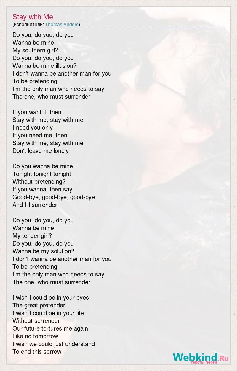 Do you, do you, do you Wanna be mine My southern girl? Do you, do you, do you Wanna be mine illusion? I don't wanna be another man for you To be pretending I'm the only man who needs to say The one, who must surrender If you want it, then Stay with me, stay with me I need you only If you need me, then Stay with me, stay with me Don't leave me lonely Do you wanna be mine Tonight tonight tonight Without pretending? If you wanna, then say Good-bye, good-bye, good-bye And I'll surrender Do you, do you, do you Wanna be mine My tender girl? Do you, do you, do you Wanna be my solution? I don't wanna be another man for you To be pretending I'm the only man who needs to say The one, who must surrender I wish I could be in your eyes The great pretender I wish I could be in your life Without surrender Our future tortures me again Like no tomorrow I wish we could just understand To end this sorrow