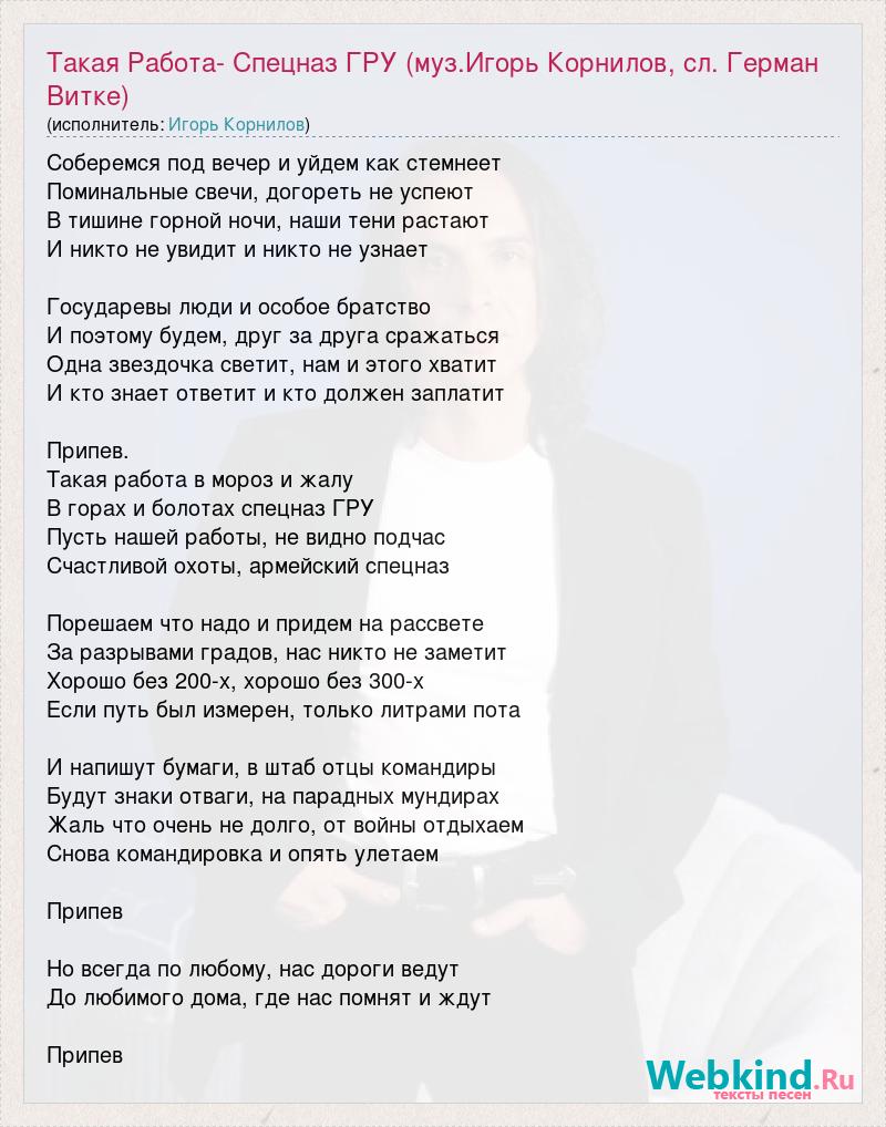 Соберемся под вечер и уйдем как стемнеет Поминальные свечи, догореть не успеют В тишине горной ночи, наши тени растают И никто не увидит и никто не узнает Государевы люди и особое братство И поэтому будем, друг за друга сражаться Одна звездочка светит, нам и этого хватит И кто знает ответит и кто должен заплатит Припев. Такая работа в мороз и жалу В горах и болотах спецназ ГРУ Пусть нашей работы, не видно подчас Счастливой охоты, армейский спецназ Порешаем что надо и придем на рассвете За разрывами градов, нас никто не заметит Хорошо без 200-х, хорошо без 300-х Если путь был измерен, только литрами пота И напишут бумаги, в штаб отцы командиры Будут знаки отваги, на парадных мундирах Жаль что очень не долго, от войны отдыхаем Снова командировка и опять улетаем Припев Но всегда по любому, нас дороги ведут До любимого дома, где нас помнят и ждут Припев