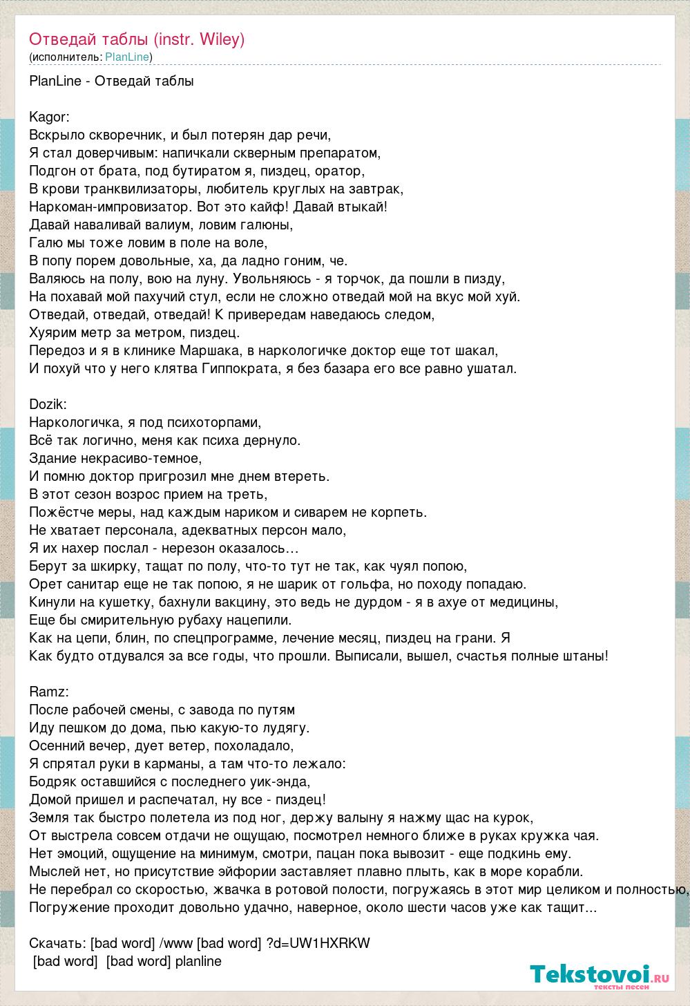 PlanLine - Отведай таблы Kagor: Вскрыло скворечник, и был потерян дар речи, Я стал доверчивым: напичкали скверным препаратом, Подгон от брата, под бутиратом я, пиздец, оратор, В крови транквилизаторы, любитель круглых на завтрак, Наркоман-импровизатор. Вот это кайф! Давай втыкай! Давай наваливай валиум, ловим галюны, Галю мы тоже ловим в поле на воле, В попу порем довольные, ха, да ладно гоним, че. Валяюсь на полу, вою на луну. Увольняюсь - я торчок, да пошли в пизду, На похавай мой пахучий стул, если не сложно отведай мой на вкус мой хуй. Отведай, отведай, отведай! К привередам наведаюсь следом, Хуярим метр за метром, пиздец. Передоз и я в клинике Маршака, в наркологичке доктор еще тот шакал, И похуй что у него клятва Гиппократа, я без базара его все равно ушатал. Dozik: Наркологичка, я под психоторпами, Всё так логично, меня как психа дернуло. Здание некрасиво-темное, И помню доктор пригрозил мне днем втереть. В этот сезон возрос прием на треть, Пожёстче меры, над каждым нариком и сиварем не корпеть. Не хватает персонала, адекватных персон мало, Я их нахер послал - нерезон оказалось… Берут за шкирку, тащат по полу, что-то тут не так, как чуял попою, Орет санитар еще не так попою, я не шарик от гольфа, но походу попадаю. Кинули на кушетку, бахнули вакцину, это ведь не дурдом - я в ахуе от медицины, Еще бы смирительную рубаху нацепили. Как на цепи, блин, по спецпрограмме, лечение месяц, пиздец на грани. Я Как будто отдувался за все годы, что прошли. Выписали, вышел, счастья полные штаны! Ramz: После рабочей смены, с завода по путям Иду пешком до дома, пью какую-то лудягу. Осенний вечер, дует ветер, похоладало, Я спрятал руки в карманы, а там что-то лежало: Бодряк оставшийся с последнего уик-энда, Домой пришел и распечатал, ну все - пиздец! Земля так быстро полетела из под ног, держу валыну я нажму щас на курок, От выстрела совсем отдачи не ощущаю, посмотрел немного ближе в руках кружка чая. Нет эмоций, ощущение на минимум, смотри, пацан пока вывозит - еще подкинь ему. Мыслей нет, но присутствие эйфории заставляет плавно плыть, как в море корабли. Не перебрал со скоростью, жвачка в ротовой полости, погружаясь в этот мир целиком и полностью, Погружение проходит довольно удачно, наверное, около шести часов уже как тащит... Скачать: [bad word] /www [bad word] ?d=UW1HXRKW [bad word] [bad word] planline