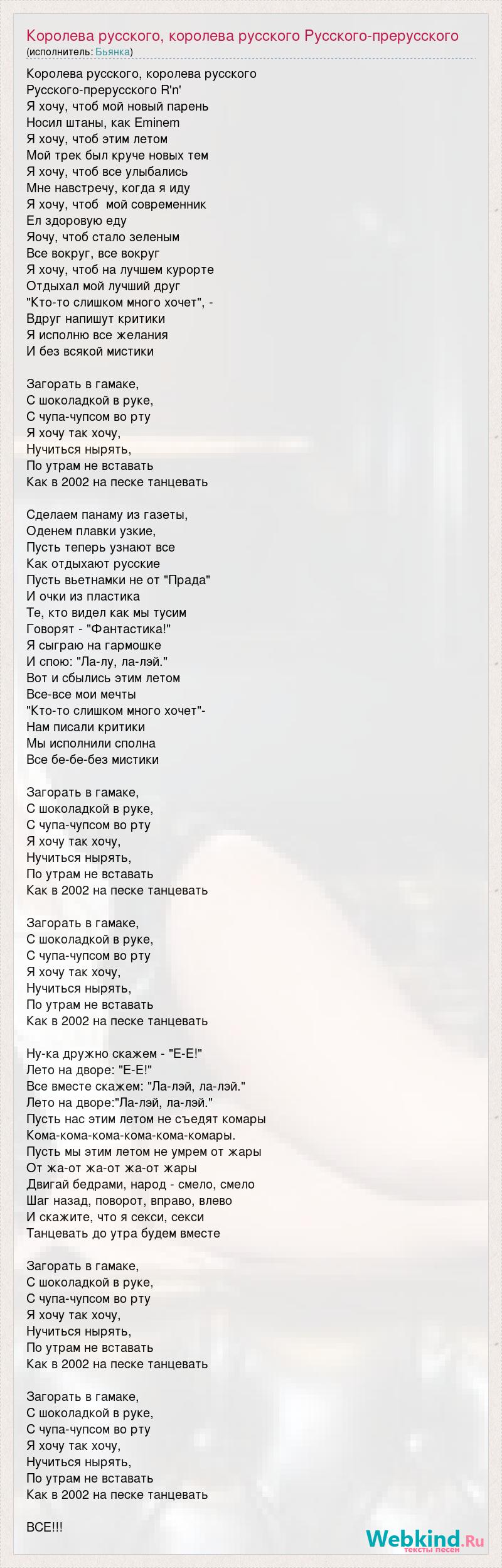 Королева русского, королева русского Русского-прерусского R'n' Я хочу, чтоб мой новый парень Носил штаны, как Eminem Я хочу, чтоб этим летом Мой трек был круче новых тем Я хочу, чтоб все улыбались Мне навстречу, когда я иду Я хочу, чтоб мой современник Ел здоровую еду Яочу, чтоб стало зеленым Все вокруг, все вокруг Я хочу, чтоб на лучшем курорте Отдыхал мой лучший друг "Кто-то слишком много хочет", - Вдруг напишут критики Я исполню все желания И без всякой мистики Загорать в гамаке, С шоколадкой в руке, С чупа-чупсом во рту Я хочу так хочу, Нучиться нырять, По утрам не вставать Как в 2002 на песке танцевать Сделаем панаму из газеты, Оденем плавки узкие, Пусть теперь узнают все Как отдыхают русские Пусть вьетнамки не от "Прада" И очки из пластика Те, кто видел как мы тусим Говорят - "Фантастика!" Я сыграю на гармошке И спою: "Ла-лу, ла-лэй." Вот и сбылись этим летом Все-все мои мечты "Кто-то слишком много хочет"- Нам писали критики Мы исполнили сполна Все бе-бе-без мистики Загорать в гамаке, С шоколадкой в руке, С чупа-чупсом во рту Я хочу так хочу, Нучиться нырять, По утрам не вставать Как в 2002 на песке танцевать Загорать в гамаке, С шоколадкой в руке, С чупа-чупсом во рту Я хочу так хочу, Нучиться нырять, По утрам не вставать Как в 2002 на песке танцевать Ну-ка дружно скажем - "Е-Е!" Лето на дворе: "Е-Е!" Все вместе скажем: "Ла-лэй, ла-лэй." Лето на дворе:"Ла-лэй, ла-лэй." Пусть нас этим летом не съедят комары Кома-кома-кома-кома-кома-комары. Пусть мы этим летом не умрем от жары От жа-от жа-от жа-от жары Двигай бедрами, народ - смело, смело Шаг назад, поворот, вправо, влево И скажите, что я секси, секси Танцевать до утра будем вместе Загорать в гамаке, С шоколадкой в руке, С чупа-чупсом во рту Я хочу так хочу, Нучиться нырять, По утрам не вставать Как в 2002 на песке танцевать Загорать в гамаке, С шоколадкой в руке, С чупа-чупсом во рту Я хочу так хочу, Нучиться нырять, По утрам не вставать Как в 2002 на песке танцевать ВСЕ!!!