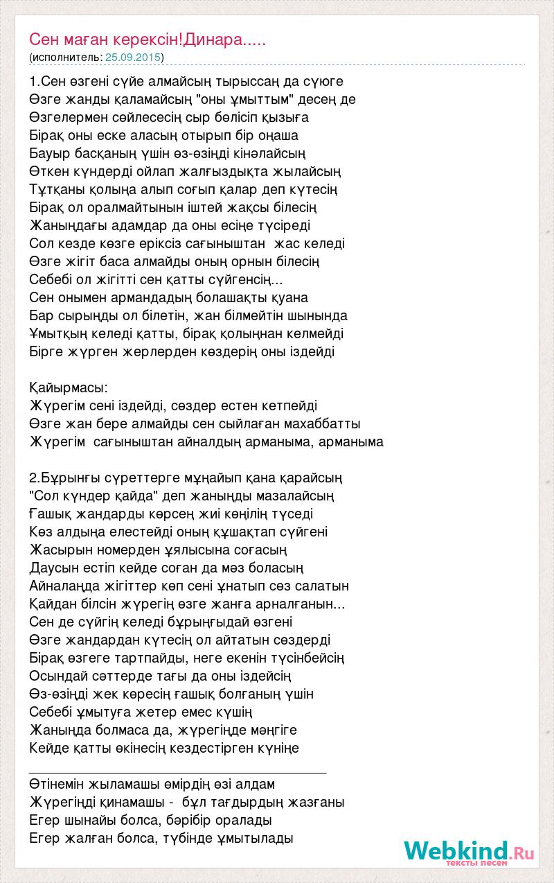 1.Сен өзгені сүйе алмайсың тырыссаң да сүюге Өзге жанды қаламайсың "оны ұмыттым" десең де Өзгелермен сөйлесесің сыр бөлісіп қызыға Бірақ оны еске аласың отырып бір оңаша Бауыр басқаның үшін өз-өзіңді кінәлайсың Өткен күндерді ойлап жалғыздықта жылайсың Тұтқаны қолыңа алып соғып қалар деп күтесің Бірақ ол оралмайтынын іштей жақсы білесің Жаныңдағы адамдар да оны есіңе түсіреді Сол кезде көзге еріксіз сағыныштан жас келеді Өзге жігіт баса алмайды оның орнын білесің Себебі ол жігітті сен қатты сүйгенсің... Сен онымен армандадың болашақты қуана Бар сырыңды ол білетін, жан білмейтін шынында Ұмытқың келеді қатты, бірақ қолыңнан келмейді Бірге жүрген жерлерден көздерің оны іздейді Қайырмасы: Жүрегім сені іздейді, сөздер естен кетпейді Өзге жан бере алмайды сен сыйлаған махаббатты Жүрегім сағыныштан айналдың арманыма, арманыма 2.Бұрынғы сүреттерге мұңайып қана қарайсың "Сол күндер қайда" деп жаныңды мазалайсың Ғашық жандарды көрсең жиі көңілің түседі Көз алдыңа елестейді оның құшақтап сүйгені Жасырын номерден ұялысына соғасың Даусын естіп кейде соған да мәз боласың Айналаңда жігіттер көп сені ұнатып сөз салатын Қайдан білсін жүрегің өзге жанға арналғанын... Сен де сүйгің келеді бұрыңғыдай өзгені Өзге жандардан күтесің ол айтатын сөздерді Бірақ өзгеге тартпайды, неге екенін түсінбейсің Осындай сәттерде тағы да оны іздейсің Өз-өзіңді жек көресің ғашық болғаның үшін Себебі ұмытуға жетер емес күшің Жаныңда болмаса да, жүрегіңде мәңгіге Кейде қатты өкінесің кездестірген күніңе _______________________________________ Өтінемін жыламашы өмірдің өзі алдам Жүрегіңді қинамашы - бұл тағдырдың жазғаны Егер шынайы болса, бәрібір оралады Егер жалған болса, түбінде ұмытылады