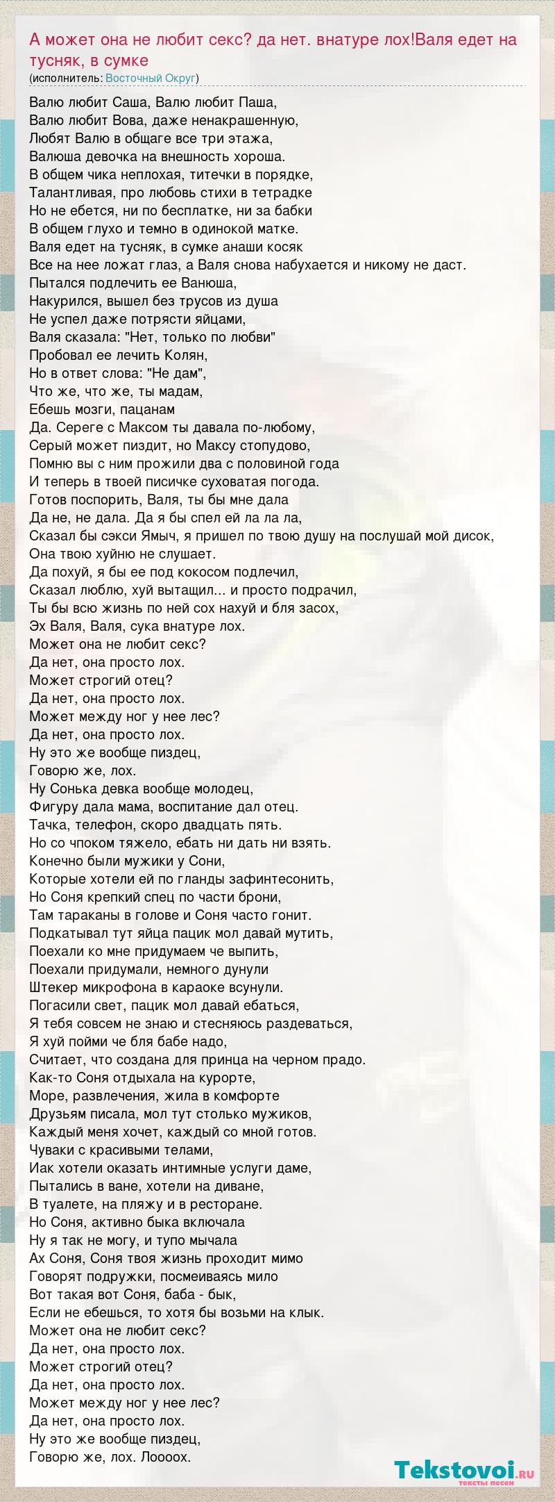 Главная→Исполнители→Восточный Округ→А может она не любит секс? да нет. внатуре лох!Валя едет на тусняк, в сумк