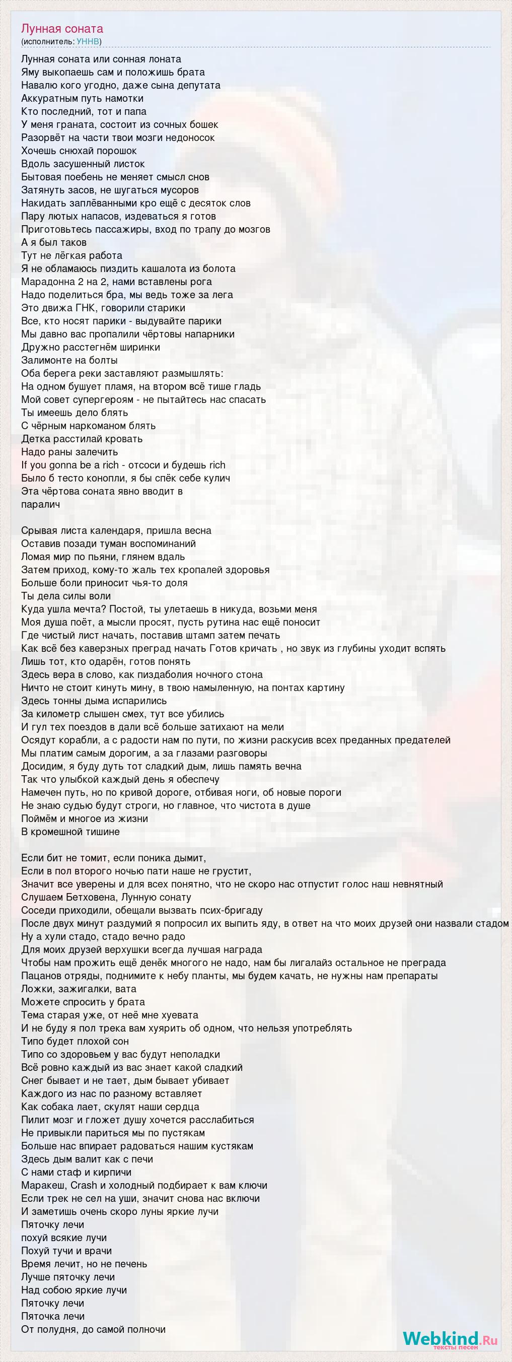 Лунная соната или сонная лоната Яму выкопаешь сам и положишь брата Навалю кого угодно, даже сына депутата Аккуратным путь намотки Кто последний, тот и папа У меня граната, состоит из сочных бошек Разорвёт на части твои мозги недоносок Хочешь снюхай порошок Вдоль засушенный листок Бытовая поебень не меняет смысл снов Затянуть засов, не шугаться мусоров Накидать заплёванными кро ещё с десяток слов Пару лютых напасов, издеваться я готов Приготовьтесь пассажиры, вход по трапу до мозгов А я был таков Тут не лёгкая работа Я не обламаюсь пиздить кашалота из болота Марадонна 2 на 2, нами вставлены рога Надо поделиться бра, мы ведь тоже за лега Это движа ГНК, говорили старики Все, кто носят парики - выдувайте парики Мы давно вас пропалили чёртовы напарники Дружно расстегнём ширинки Залимонте на болты Оба берега реки заставляют размышлять: На одном бушует пламя, на втором всё тише гладь Мой совет супергероям - не пытайтесь нас спасать Ты имеешь дело блять С чёрным наркоманом блять Детка расстилай кровать Надо раны залечить If you gonna be a rich - отсоси и будешь rich Было б тесто конопли, я бы спёк себе кулич Эта чёртова соната явно вводит в паралич Срывая листа календаря, пришла весна Оставив позади туман воспоминаний Ломая мир по пьяни, глянем вдаль Затем приход, кому-то жаль тех кропалей здоровья Больше боли приносит чья-то доля Ты дела силы воли Куда ушла мечта? Постой, ты улетаешь в никуда, возьми меня Моя душа поёт, а мысли просят, пусть рутина нас ещё поносит Где чистый лист начать, поставив штамп затем печать Как всё без каверзных преград начать Готов кричать , но звук из глубины уходит вспять Лишь тот, кто одарён, готов понять Здесь вера в слово, как пиздаболия ночного стона Ничто не стоит кинуть мину, в твою намыленную, на понтах картину Здесь тонны дыма испарились За километр слышен смех, тут все убились И гул тех поездов в дали всё больше затихают на мели Осядут корабли, а с радости нам по пути, по жизни раскусив всех преданных предателей Мы платим самым дорогим, а за глазами разговоры Досидим, я буду дуть тот сладкий дым, лишь память вечна Так что улыбкой каждый день я обеспечу Намечен путь, но по кривой дороге, отбивая ноги, об новые пороги Не знаю судью будут строги, но главное, что чистота в душе Поймём и многое из жизни В кромешной тишине Если бит не томит, если поника дымит, Если в пол второго ночью пати наше не грустит, Значит все уверены и для всех понятно, что не скоро нас отпустит голос наш невнятный Слушаем Бетховена, Лунную сонату Соседи приходили, обещали вызвать псих-бригаду После двух минут раздумий я попросил их выпить яду, в ответ на что моих друзей они назвали стадом Ну а хули стадо, стадо вечно радо Для моих друзей верхушки всегда лучшая награда Чтобы нам прожить ещё денёк многого не надо, нам бы лигалайз остальное не преграда Пацанов отряды, поднимите к небу планты, мы будем качать, не нужны нам препараты Ложки, зажигалки, вата Можете спросить у брата Тема старая уже, от неё мне хуевата И не буду я пол трека вам хуярить об одном, что нельзя употреблять Типо будет плохой сон Типо со здоровьем у вас будут неполадки Всё ровно каждый из вас знает какой сладкий Снег бывает и не тает, дым бывает убивает Каждого из нас по разному вставляет Как собака лает, скулят наши сердца Пилит мозг и гложет душу хочется расслабиться Не привыкли париться мы по 