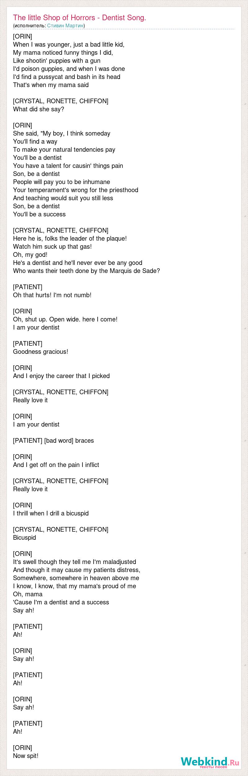 [ORIN] When I was younger, just a bad little kid, My mama noticed funny things I did, Like shootin' puppies with a gun I'd poison guppies, and when I was done I'd find a pussycat and bash in its head That's when my mama said [CRYSTAL, RONETTE, CHIFFON] What did she say? [ORIN] She said, "My boy, I think someday You'll find a way To make your natural tendencies pay You'll be a dentist You have a talent for causin' things pain Son, be a dentist People will pay you to be inhumane Your temperament's wrong for the priesthood And teaching would suit you still less Son, be a dentist You'll be a success [CRYSTAL, RONETTE, CHIFFON] Here he is, folks the leader of the plaque! Watch him suck up that gas! Oh, my god! He's a dentist and he'll never ever be any good Who wants their teeth done by the Marquis de Sade? [PATIENT] Oh that hurts! I'm not numb! [ORIN] Oh, shut up. Open wide. here I come! I am your dentist [PATIENT] Goodness gracious! [ORIN] And I enjoy the career that I picked [CRYSTAL, RONETTE, CHIFFON] Really love it [ORIN] I am your dentist [PATIENT] [bad word] braces [ORIN] And I get off on the pain I inflict [CRYSTAL, RONETTE, CHIFFON] Really love it [ORIN] I thrill when I drill a bicuspid [CRYSTAL, RONETTE, CHIFFON] Bicuspid [ORIN] It's swell though they tell me I'm maladjusted And though it may cause my patients distress, Somewhere, somewhere in heaven above me I know, I know, that my mama's proud of me Oh, mama 'Cause I'm a dentist and a success Say ah! [PATIENT] Ah! [ORIN] Say ah! [PATIENT] Ah! [ORIN] Say ah! [PATIENT] Ah! [ORIN] Now spit!