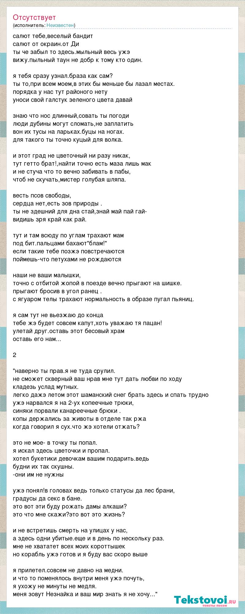 салют тебе,веселый бандит салют от окраин.от Ди ты че забыл то здесь.мыльный весь ужэ вижу.пыльный таун не добр к тому кто один. я тебя сразу узнал.браза как сам? ты то,при всем моем,в этих бы меньше бы лазал местах. порядка у нас тут районого нету уноси свой галстук зеленого цвета давай знаю что нос длинный,совать ты погоди люди дубины могут сломать,не заплатить вон их тусы на ларьках.буцы на ногах. для такого ты точно куцый для волка. и этот град не цветочный ни разу никак, тут гетто брат!,найти точно есть маза лишь мак и не стуча что то вечно забивать в пабы, чтоб не скучать,мистер голубая шляпа. весть псов свободы, сердца нет,есть зов природы . ты не здешний для дна стай,знай май пай гай- видишь зря край как рай. тут и там всюду по углам трахают мам под бит.пальцами бахают"блам!" если такие тебе позжэ повстречаются поймешь-что петухами не рождаются наши не ваши малышки, точно с отбитой жопой в поезде вечно прыгают на шишке. прыгают бросив в угол ранец . с ягуаром телы трахают нормальность в образе пугал пьяниц. я сам тут не вьезжаю до конца тебе жэ будет совсем капут,хоть уважаю тя пацан! улетай друг.оставь этот бесовый храм оставь его нам... 2 "наверно ты прав.я не туда срулил. не сможет скверный ваш нрав мне тут дать любви по ходу кладезь услад мутных. легко дажэ летом этот шаманский снег брать здесь и спать трудно ужэ нарвался я на 2-ух копеечные трюки, синяки порвали канареечные брюки . копы держались за животы в отделе так ржа когда говорил я сух.что жэ хотели отжать? это не мое- в точку ты попал. я искал здесь цветочки и пропал. хотел букетики девочкам вашим подарить.ведь будни их так скушны. -они им не нужны ужэ понял!в головах ведь только статусы да лес брани, градусы да секс в бане. это вот эти буду рожать дамы алкаши? это что мне скажи?это вот это жизнь? и не встретишь смерть на улицах у нас, а здесь одни убитые.еще и в день по нескольку раз. мне не хвататет всех моих короттышек но корабль ужэ готов и я буду вас скоро выше я прилетел.совсем не давно на медни. и что то поменялось внутри меня ужэ почуть, я ухожу не минуты не медля. меня зовут Незнайка и ваш мир знать я не хочу..."