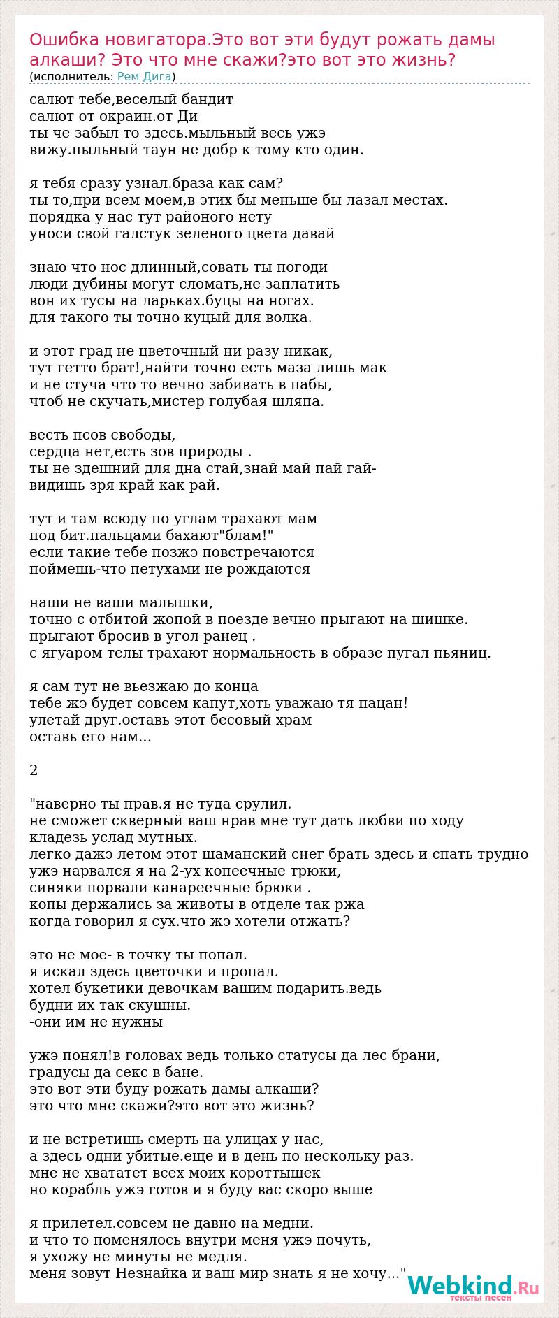 Главная→Исполнители→Рем Дига→Ошибка новигатора.Это вот эти будут рожать дамы алкаши? Это что мне скажи?это