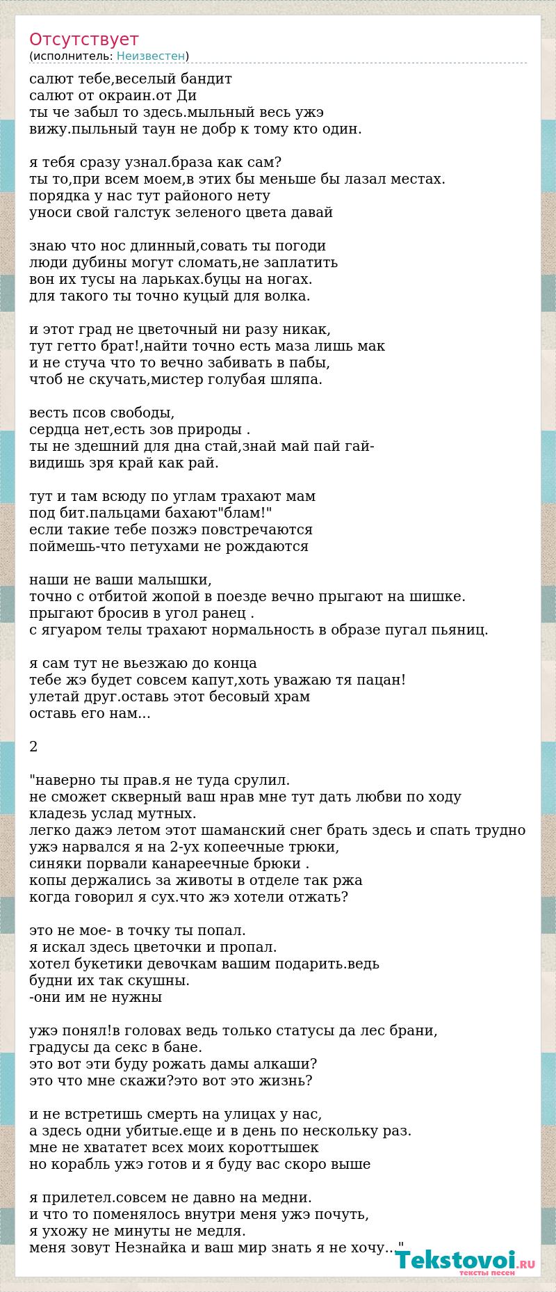 салют тебе,веселый бандит салют от окраин.от Ди ты че забыл то здесь.мыльный весь ужэ вижу.пыльный таун не добр к тому кто один. я тебя сразу узнал.браза как сам? ты то,при всем моем,в этих бы меньше бы лазал местах. порядка у нас тут районого нету уноси свой галстук зеленого цвета давай знаю что нос длинный,совать ты погоди люди дубины могут сломать,не заплатить вон их тусы на ларьках.буцы на ногах. для такого ты точно куцый для волка. и этот град не цветочный ни разу никак, тут гетто брат!,найти точно есть маза лишь мак и не стуча что то вечно забивать в пабы, чтоб не скучать,мистер голубая шляпа. весть псов свободы, сердца нет,есть зов природы . ты не здешний для дна стай,знай май пай гай- видишь зря край как рай. тут и там всюду по углам трахают мам под бит.пальцами бахают"блам!" если такие тебе позжэ повстречаются поймешь-что петухами не рождаются наши не ваши малышки, точно с отбитой жопой в поезде вечно прыгают на шишке. прыгают бросив в угол ранец . с ягуаром телы трахают нормальность в образе пугал пьяниц. я сам тут не вьезжаю до конца тебе жэ будет совсем капут,хоть уважаю тя пацан! улетай друг.оставь этот бесовый храм оставь его нам... 2 "наверно ты прав.я не туда срулил. не сможет скверный ваш нрав мне тут дать любви по ходу кладезь услад мутных. легко дажэ летом этот шаманский снег брать здесь и спать трудно ужэ нарвался я на 2-ух копеечные трюки, синяки порвали канареечные брюки . копы держались за животы в отделе так ржа когда говорил я сух.что жэ хотели отжать? это не мое- в точку ты попал. я искал здесь цветочки и пропал. хотел букетики девочкам вашим подарить.ведь будни их так скушны. -они им не нужны ужэ понял!в головах ведь только статусы да лес брани, градусы да секс в бане. это вот эти буду рожать дамы алкаши? это что мне скажи?это вот это жизнь? и не встретишь смерть на улицах у нас, а здесь одни убитые.еще и в день по нескольку раз. мне не хвататет всех моих короттышек но корабль ужэ готов и я буду вас скоро выше я прилетел.совсем не давно на медни. и что то поменялось внутри меня ужэ почуть, я ухожу не минуты не медля. меня зовут Незнайка и ваш мир знать я не хочу..."