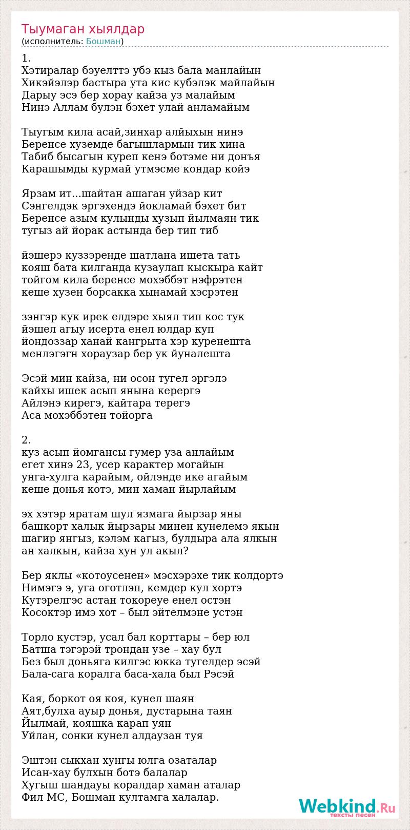 1. Хэтиралар бэуелттэ убэ кыз бала манлайын Хикэйэлэр бастыра ута кис кубэлэк майлайын Дарыу эсэ бер хорау кайза уз малайым Нинэ Аллам булэн бэхет улай анламайым Тыугым кила асай,зинхар алйыхын нинэ Беренсе хуземде багышлармын тик хина Табиб бысагын куреп кенэ ботэме ни донъя Карашымды курмай утмэсме кондар койэ Ярзам ит...шайтан ашаган уйзар кит Сэнгелдэк эргэхендэ йокламай бэхет бит Беренсе азым кулынды хузып йылмаян тик тугыз ай йорак астында бер тип тиб йэшерэ куззэренде шатлана ишета тать кояш бата килганда кузаулап кыскыра кайт тойгом кила беренсе мохэббэт нэфрэтен кеше хузен борсакка хынамай хэсрэтен зэнгэр кук ирек елдэре хыял тип кос тук йэшел агыу исерта енел юлдар куп йондоззар ханай кангрыта хэр куренешта менлэгэгн хораузар бер ук йуналешта Эсэй мин кайза, ни осон тугел эргэлэ кайхы ишек асып янына керергэ Айлэнэ кирегэ, кайтара терегэ Аса мохэббэтен тойорга 2. куз асып йомгансы гумер уза анлайым егет хинэ 23, усер карактер могайын унга-хулга карайым, ойлэнде ике агайым кеше донья котэ, мин хаман йырлайым эх хэтэр яратам шул язмага йырзар яны башкорт халык йырзары минен кунелемэ якын шагир янгыз, кэлэм кагыз, булдыра ала ялкын ан халкын, кайза хун ул акыл? Бер яклы «котоусенен» мэсхэрэхе тик колдортэ Нимэгэ э, уга оготлэп, кемдер кул хортэ Кутэрелгэс астан токореуе енел остэн Косоктэр имэ хот – был эйтелмэне устэн Торло кустэр, усал бал корттары – бер юл Батша тэгэрэй трондан узе – хау бул Без был доньяга килгэс юкка тугелдер эсэй Бала-сага коралга баса-хала был Рэсэй Кая, боркот оя коя, кунел шаян Аят,булха ауыр донья, дустарына таян Йылмай, кояшка карап уян Уйлан, сонки кунел алдаузан туя Эштэн сыкхан хунгы юлга озаталар Исан-хау булхын ботэ балалар Хугыш шандауы коралдар хаман аталар Фил МС, Бошман култамга халалар.