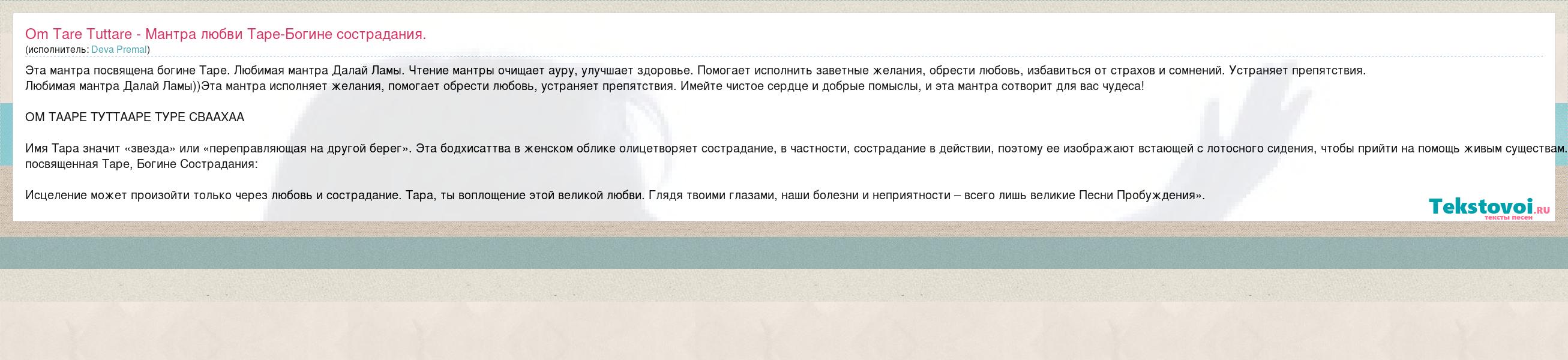 А как ты думаешь, о чем песня "Om Tare Tuttare - Мантра любви Таре-Богине сострадания." ?