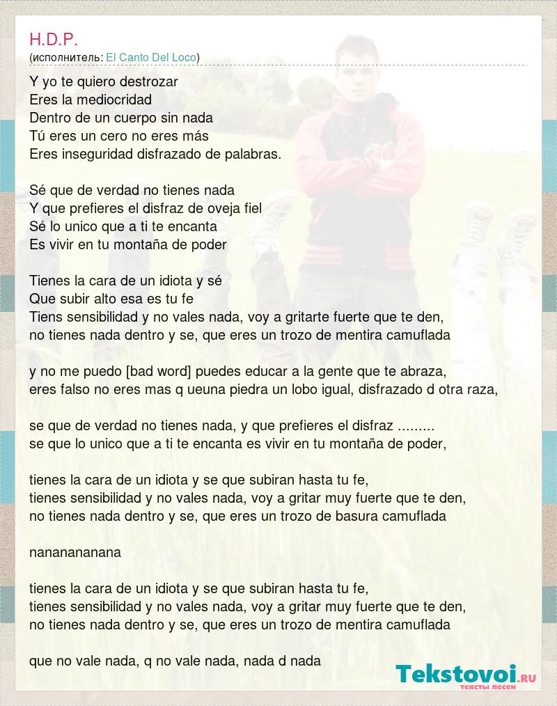 Y yo te quiero destrozar Eres la mediocridad Dentro de un cuerpo sin nada Tú eres un cero no eres más Eres inseguridad disfrazado de palabras. Sé que de verdad no tienes nada Y que prefieres el disfraz de oveja fiel Sé lo unico que a ti te encanta Es vivir en tu montaña de poder Tienes la cara de un idiota y sé Que subir alto esa es tu fe Tiens sensibilidad y no vales nada, voy a gritarte fuerte que te den, no tienes nada dentro y se, que eres un trozo de mentira camuflada y no me puedo [bad word] puedes educar a la gente que te abraza, eres falso no eres mas q ueuna piedra un lobo igual, disfrazado d otra raza, se que de verdad no tienes nada, y que prefieres el disfraz ......... se que lo unico que a ti te encanta es vivir en tu montaña de poder, tienes la cara de un idiota y se que subiran hasta tu fe, tienes sensibilidad y no vales nada, voy a gritar muy fuerte que te den, no tienes nada dentro y se, que eres un trozo de basura camuflada nananananana tienes la cara de un idiota y se que subiran hasta tu fe, tienes sensibilidad y no vales nada, voy a gritar muy fuerte que te den, no tienes nada dentro y se, que eres un trozo de mentira camuflada que no vale nada, q no vale nada, nada d nada