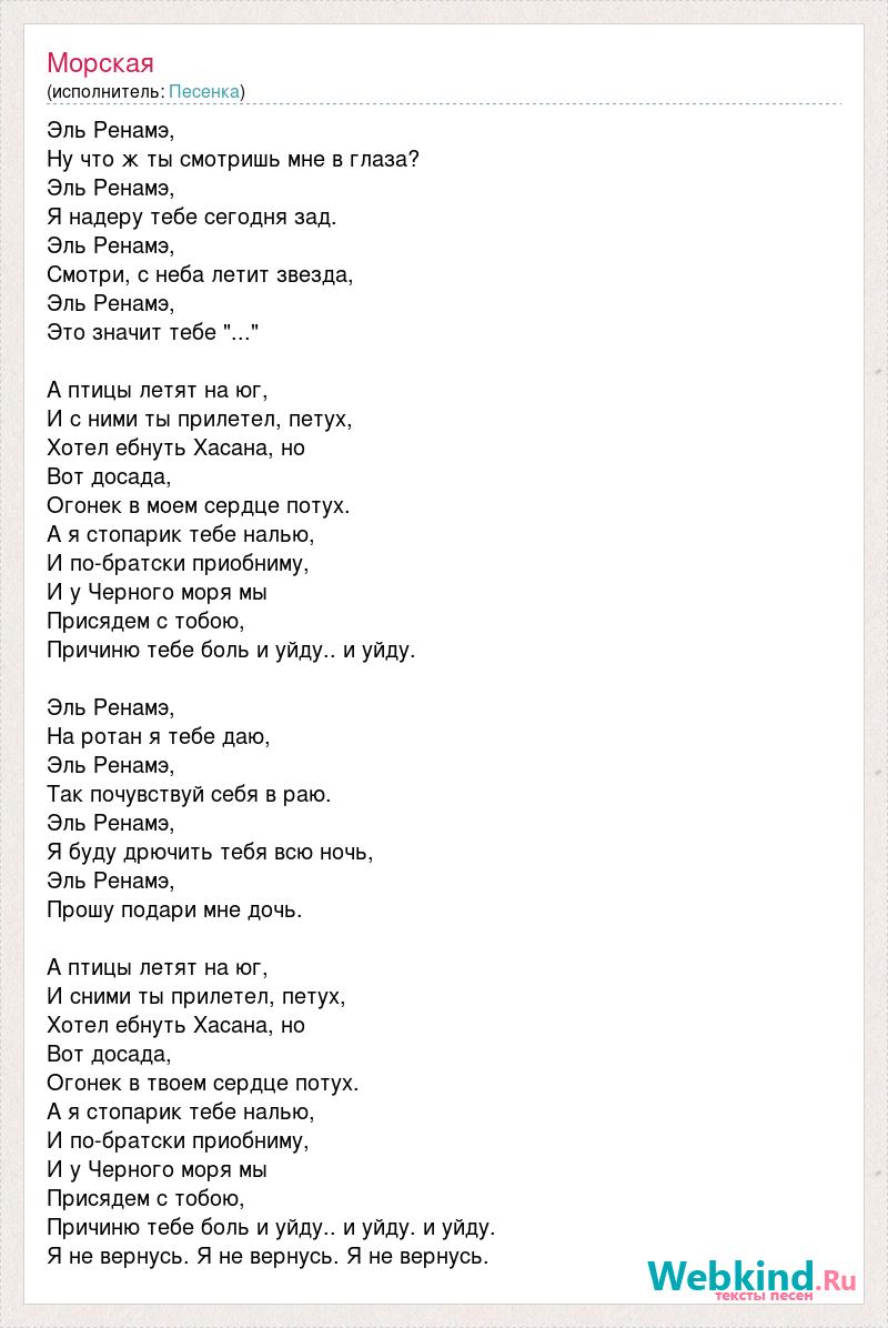 Эль Ренамэ, Ну что ж ты смотришь мне в глаза? Эль Ренамэ, Я надеру тебе сегодня зад. Эль Ренамэ, Смотри, с неба летит звезда, Эль Ренамэ, Это значит тебе "..." А птицы летят на юг, И с ними ты прилетел, петух, Хотел ебнуть Хасана, но Вот досада, Огонек в моем сердце потух. А я стопарик тебе налью, И по-братски приобниму, И у Черного моря мы Присядем с тобою, Причиню тебе боль и уйду.. и уйду. Эль Ренамэ, На ротан я тебе даю, Эль Ренамэ, Так почувствуй себя в раю. Эль Ренамэ, Я буду дрючить тебя всю ночь, Эль Ренамэ, Прошу подари мне дочь. А птицы летят на юг, И сними ты прилетел, петух, Хотел ебнуть Хасана, но Вот досада, Огонек в твоем сердце потух. А я стопарик тебе налью, И по-братски приобниму, И у Черного моря мы Присядем с тобою, Причиню тебе боль и уйду.. и уйду. и уйду. Я не вернусь. Я не вернусь. Я не вернусь.