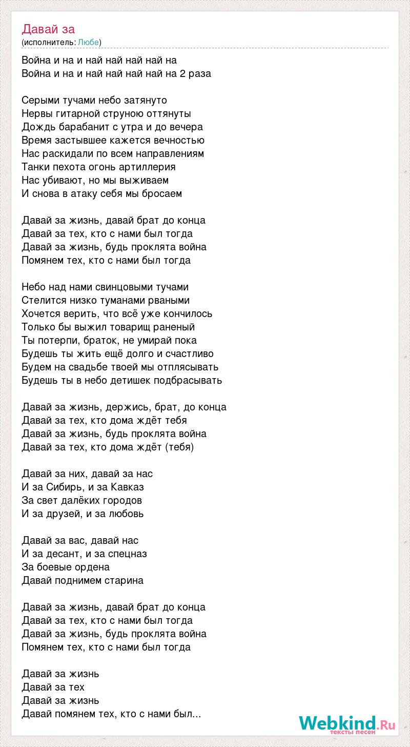 Война и на и най най най най на Война и на и най най най най на 2 раза Серыми тучами небо затянуто Нервы гитарной струною оттянуты Дождь барабанит с утра и до вечера Время застывшее кажется вечностью Нас раскидали по всем направлениям Танки пехота огонь артиллерия Нас убивают, но мы выживаем И снова в атаку себя мы бросаем Давай за жизнь, давай брат до конца Давай за тех, кто с нами был тогда Давай за жизнь, будь проклята война Помянем тех, кто с нами был тогда Небо над нами свинцовыми тучами Стелится низко туманами рваными Хочется верить, что всё уже кончилось Только бы выжил товарищ раненый Ты потерпи, браток, не умирай пока Будешь ты жить ещё долго и счастливо Будем на свадьбе твоей мы отплясывать Будешь ты в небо детишек подбрасывать Давай за жизнь, держись, брат, до конца Давай за тех, кто дома ждёт тебя Давай за жизнь, будь проклята война Давай за тех, кто дома ждёт (тебя) Давай за них, давай за нас И за Сибирь, и за Кавказ За свет далёких городов И за друзей, и за любовь Давай за вас, давай нас И за десант, и за спецназ За боевые ордена Давай поднимем старина Давай за жизнь, давай брат до конца Давай за тех, кто с нами был тогда Давай за жизнь, будь проклята война Помянем тех, кто с нами был тогда Давай за жизнь Давай за тех Давай за жизнь Давай помянем тех, кто с нами был...