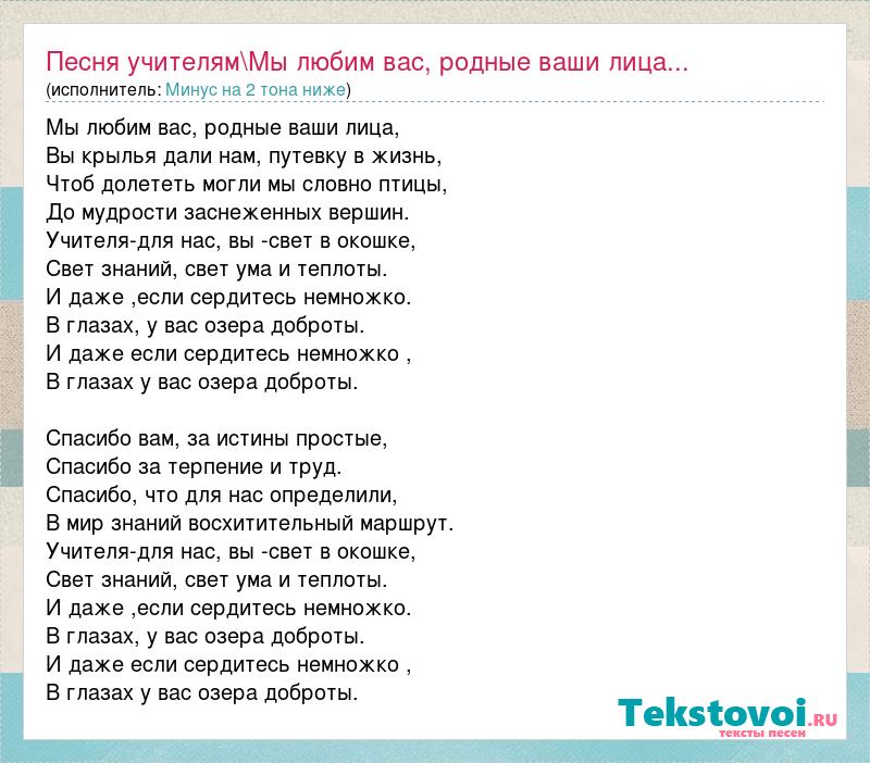 Мы любим вас, родные ваши лица, Вы крылья дали нам, путевку в жизнь, Чтоб долететь могли мы словно птицы, До мудрости заснеженных вершин. Учителя-для нас, вы -свет в окошке, Свет знаний, свет ума и теплоты. И даже ,если сердитесь немножко. В глазах, у вас озера доброты. И даже если сердитесь немножко , В глазах у вас озера доброты. Спасибо вам, за истины простые, Спасибо за терпение и труд. Спасибо, что для нас определили, В мир знаний восхитительный маршрут. Учителя-для нас, вы -свет в окошке, Свет знаний, свет ума и теплоты. И даже ,если сердитесь немножко. В глазах, у вас озера доброты. И даже если сердитесь немножко , В глазах у вас озера доброты.