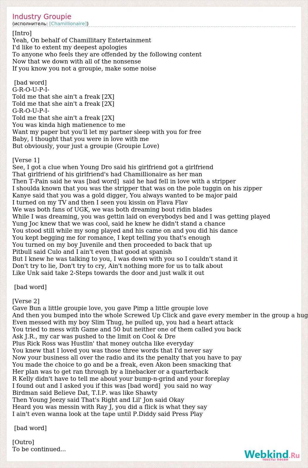 [Intro] Yeah, On behalf of Chamillitary Entertainment I'd like to extent my deepest apologies To anyone who feels they are offended by the following content Now that we down with all of the nonsense If you know you not a groupie, make some noise [bad word] G-R-O-U-P-I- Told me that she ain't a freak [2X] Told me that she ain't a freak [2X] G-R-O-U-P-I- Told me that she ain't a freak [2X] You was kinda high matienence to me Want my paper but you'll let my partner sleep with you for free Baby, I thought that you were in love with me But obviously, your just a groupie (Groupie Love) [Verse 1] See, I got a clue when Young Dro said his girlfriend got a girlfriend That girlfriend of his girlfriend's had Chamillionaire as her man Then T-Pain said he was [bad word] said he had fell in love with a stripper I shoulda known that you was the stripper that was on the pole tuggin on his zipper Kanye said that you was a gold digger, You always wanted to be major paid I turned on my TV and then I seen you kissin on Flava Flav We was both fans of UGK, we was both dreaming bout ridin blades While I was dreaming, you was gettin laid on everybodys bed and I was getting played Yung Joc knew that we was cool, said he knew he didn't stand a chance You stood still while my song played and his came on and you did his dance You kept begging me for romance, I kept telling you that's enough You turned on my boy Juvenile and then proceeded to back that up Pitbull said Culo and I ain't even that good at spanish But I knew he was talking to you, I was down with you so I couldn't stand it Don't try to lie, Don't try to cry, Ain't nothing more for us to talk about Like Unk said take 2-Steps towards the door and just walk it out [bad word] [Verse 2] Gave Bun a little groupie love, you gave Pimp a little groupie love And then you bumped into the whole Screwed Up Click and gave every member in the group a hug Even messed with my boy Slim Thug, he pulled up, you had a heart attack You tried to mess with Game and 50 but neither one of them called you back Ask J.R., my car was pushed to the limit on Cool & Dre Plus Rick Ross was Hustlin' that money outcha like everyday You knew that I loved you was those three words that I'd never say Now your business all over the radio and its the penalty that you have to pay You made the choice to go and be a freak, even Akon been smacking that Her plan was to get ran through by a linebacker or a quarterback R Kelly didn't have to tell me about your bump-n-grind and your foreplay I found out and I asked you if this was [bad word] you said no way Birdman said Believe Dat, T.I.P. was like Shawty Then Young Jeezy said That's Right and Lil' Jon said Okay Heard you was messin with Ray J, you did a flick is what they say I ain't even wanna look at the tape until P.Diddy said Press Play [bad word] [Outro] To be continued...