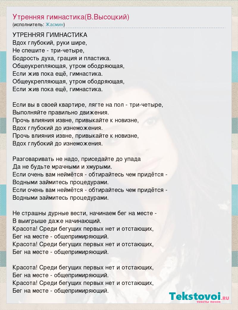 УТРЕННЯЯ ГИМНАСТИКА Вдох глубокий, руки шире, Не спешите - три-четыре, Бодрость духа, грация и пластика. Общеукрепляющая, утром ободряющая, Если жив пока ещё, гимнастика. Общеукрепляющая, утром ободряющая, Если жив пока ещё, гимнастика. Если вы в своей квартире, лягте на пол - три-четыре, Выполняйте правильно движения. Прочь влияния извне, привыкайте к новизне, Вдох глубокий до изнеможения. Прочь влияния извне, привыкайте к новизне, Вдох глубокий до изнеможения. Разговаривать не надо, приседайте до упада Да не будьте мрачными и хмурыми. Если очень вам неймётся - обтирайтесь чем придётся - Водными займитесь процедурами. Если очень вам неймётся - обтирайтесь чем придётся - Водными займитесь процедурами. Не страшны дурные вести, начинаем бег на месте - В выигрыше даже начинающий. Красота! Среди бегущих первых нет и отстающих, Бег на месте - общепримиряющий. Красота! Среди бегущих первых нет и отстающих, Бег на месте - общепримиряющий. Красота! Среди бегущих первых нет и отстающих, Бег на месте - общепримиряющий. Красота! Среди бегущих первых нет и отстающих, Бег на месте - общепримиряющий.