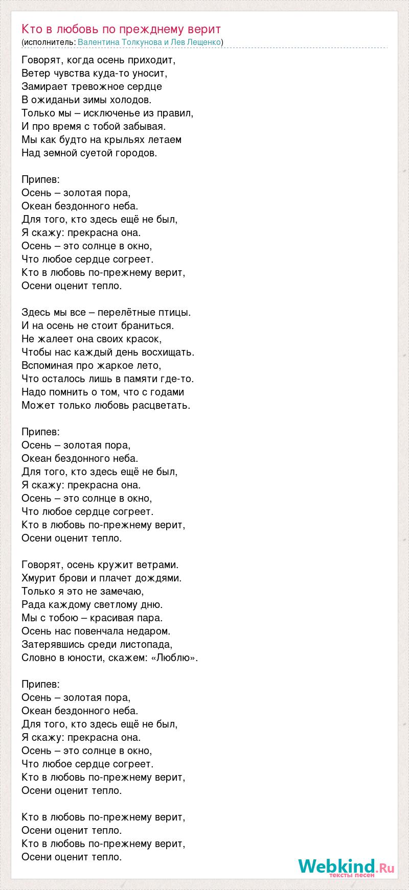 Говорят, когда осень приходит, Ветер чувства куда-то уносит, Замирает тревожное сердце В ожиданьи зимы холодов. Только мы – исключенье из правил, И про время с тобой забывая. Мы как будто на крыльях летаем Над земной суетой городов. Припев: Осень – золотая пора, Океан бездонного неба. Для того, кто здесь ещё не был, Я скажу: прекрасна она. Осень – это солнце в окно, Что любое сердце согреет. Кто в любовь по-прежнему верит, Осени оценит тепло. Здесь мы все – перелётные птицы. И на осень не стоит браниться. Не жалеет она своих красок, Чтобы нас каждый день восхищать. Вспоминая про жаркое лето, Что осталось лишь в памяти где-то. Надо помнить о том, что с годами Может только любовь расцветать. Припев: Осень – золотая пора, Океан бездонного неба. Для того, кто здесь ещё не был, Я скажу: прекрасна она. Осень – это солнце в окно, Что любое сердце согреет. Кто в любовь по-прежнему верит, Осени оценит тепло. Говорят, осень кружит ветрами. Хмурит брови и плачет дождями. Только я это не замечаю, Рада каждому светлому дню. Мы с тобою – красивая пара. Осень нас повенчала недаром. Затерявшись среди листопада, Словно в юности, скажем: «Люблю». Припев: Осень – золотая пора, Океан бездонного неба. Для того, кто здесь ещё не был, Я скажу: прекрасна она. Осень – это солнце в окно, Что любое сердце согреет. Кто в любовь по-прежнему верит, Осени оценит тепло. Кто в любовь по-прежнему верит, Осени оценит тепло. Кто в любовь по-прежнему верит, Осени оценит тепло.