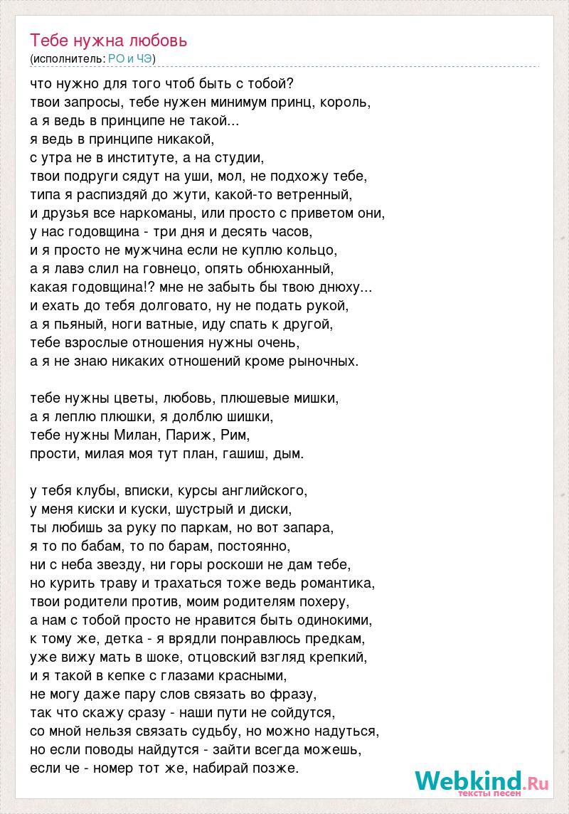 что нужно для того чтоб быть с тобой? твои запросы, тебе нужен минимум принц, король, а я ведь в принципе не такой... я ведь в принципе никакой, с утра не в институте, а на студии, твои подруги сядут на уши, мол, не подхожу тебе, типа я распиздяй до жути, какой-то ветренный, и друзья все наркоманы, или просто с приветом они, у нас годовщина - три дня и десять часов, и я просто не мужчина если не куплю кольцо, а я лавэ слил на говнецо, опять обнюханный, какая годовщина!? мне не забыть бы твою днюху... и ехать до тебя долговато, ну не подать рукой, а я пьяный, ноги ватные, иду спать к другой, тебе взрослые отношения нужны очень, а я не знаю никаких отношений кроме рыночных. тебе нужны цветы, любовь, плюшевые мишки, а я леплю плюшки, я долблю шишки, тебе нужны Милан, Париж, Рим, прости, милая моя тут план, гашиш, дым. у тебя клубы, вписки, курсы английского, у меня киски и куски, шустрый и диски, ты любишь за руку по паркам, но вот запара, я то по бабам, то по барам, постоянно, ни с неба звезду, ни горы роскоши не дам тебе, но курить траву и трахаться тоже ведь романтика, твои родители против, моим родителям похеру, а нам с тобой просто не нравится быть одинокими, к тому же, детка - я врядли понравлюсь предкам, уже вижу мать в шоке, отцовский взгляд крепкий, и я такой в кепке с глазами красными, не могу даже пару слов связать во фразу, так что скажу сразу - наши пути не сойдутся, со мной нельзя связать судьбу, но можно надуться, но если поводы найдутся - зайти всегда можешь, если че - номер тот же, набирай позже.