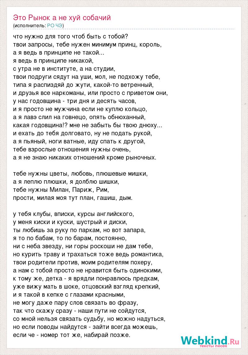 что нужно для того чтоб быть с тобой? твои запросы, тебе нужен минимум принц, король, а я ведь в принципе не такой... я ведь в принципе никакой, с утра не в институте, а на студии, твои подруги сядут на уши, мол, не подхожу тебе, типа я распиздяй до жути, какой-то ветренный, и друзья все наркоманы, или просто с приветом они, у нас годовщина - три дня и десять часов, и я просто не мужчина если не куплю кольцо, а я лавэ слил на говнецо, опять обнюханный, какая годовщина!? мне не забыть бы твою днюху... и ехать до тебя долговато, ну не подать рукой, а я пьяный, ноги ватные, иду спать к другой, тебе взрослые отношения нужны очень, а я не знаю никаких отношений кроме рыночных. тебе нужны цветы, любовь, плюшевые мишки, а я леплю плюшки, я долблю шишки, тебе нужны Милан, Париж, Рим, прости, милая моя тут план, гашиш, дым. у тебя клубы, вписки, курсы английского, у меня киски и куски, шустрый и диски, ты любишь за руку по паркам, но вот запара, я то по бабам, то по барам, постоянно, ни с неба звезду, ни горы роскоши не дам тебе, но курить траву и трахаться тоже ведь романтика, твои родители против, моим родителям похеру, а нам с тобой просто не нравится быть одинокими, к тому же, детка - я врядли понравлюсь предкам, уже вижу мать в шоке, отцовский взгляд крепкий, и я такой в кепке с глазами красными, не могу даже пару слов связать во фразу, так что скажу сразу - наши пути не сойдутся, со мной нельзя связать судьбу, но можно надуться, но если поводы найдутся - зайти всегда можешь, если че - номер тот же, набирай позже.